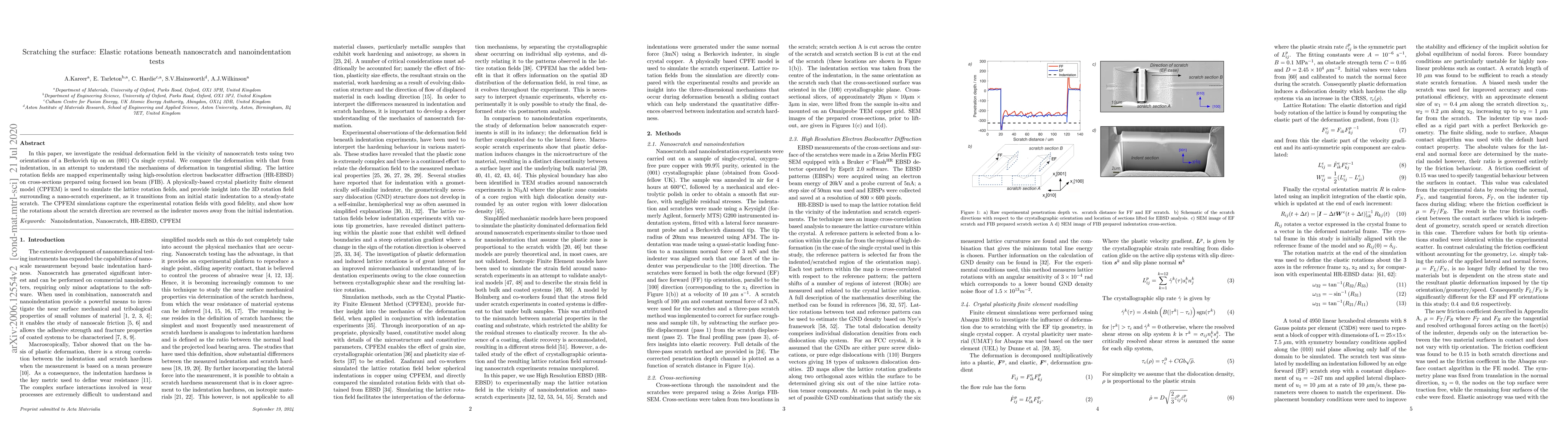 Researchers studied the deformation field in copper crystals under nanoscratch tests and found that lattice rotations reverse as the indenter moves away from the initial indentation site.