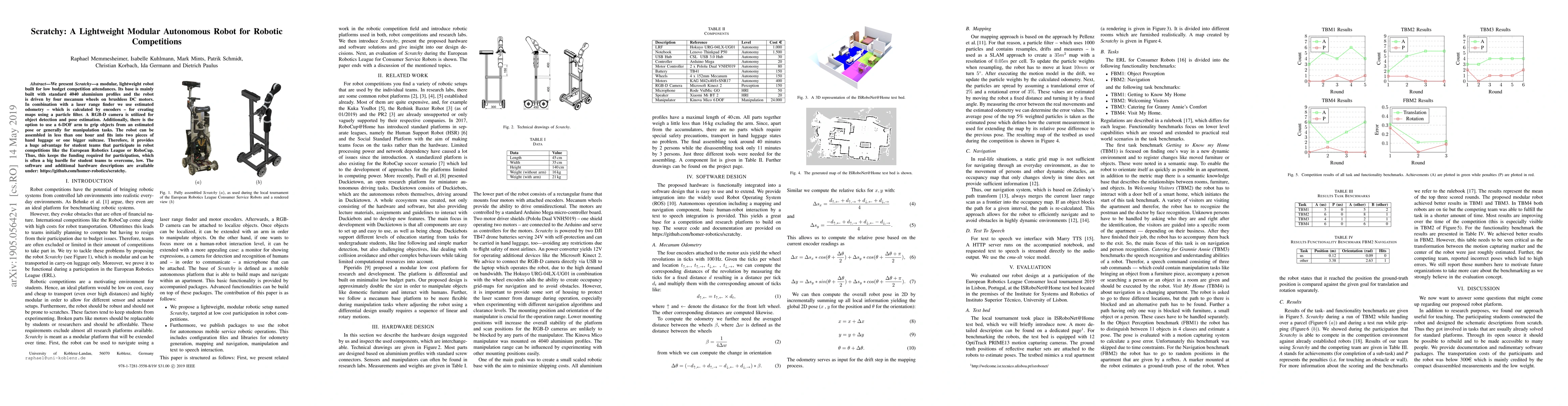 We present Scratchy---a modular, lightweight robot built for low budget competition attendances. Its base is mainly built with standard 4040 aluminium profiles and the robot is driven by four mecanum wheels on brushless DC motors. In combination with a laser range finder we use estimated odometry -- which is calculated by encoders -- for creating maps using a particle filter. A RGB-D camera is utilized for object detection and pose estimation. Additionally, there is the option to use a 6-DOF arm to grip objects from an estimated pose or generally for manipulation tasks. The robot can be assembled in less than one hour and fits into two pieces of hand luggage or one bigger suitcase. Therefore, it provides a huge advantage for student teams that participate in robot competitions like the European Robotics League or RoboCup. Thus, this keeps the funding required for participation, which is often a big hurdle for student teams to overcome, low. The software and additional hardware descriptions are available under: https://github.com/homer-robotics/scratchy.