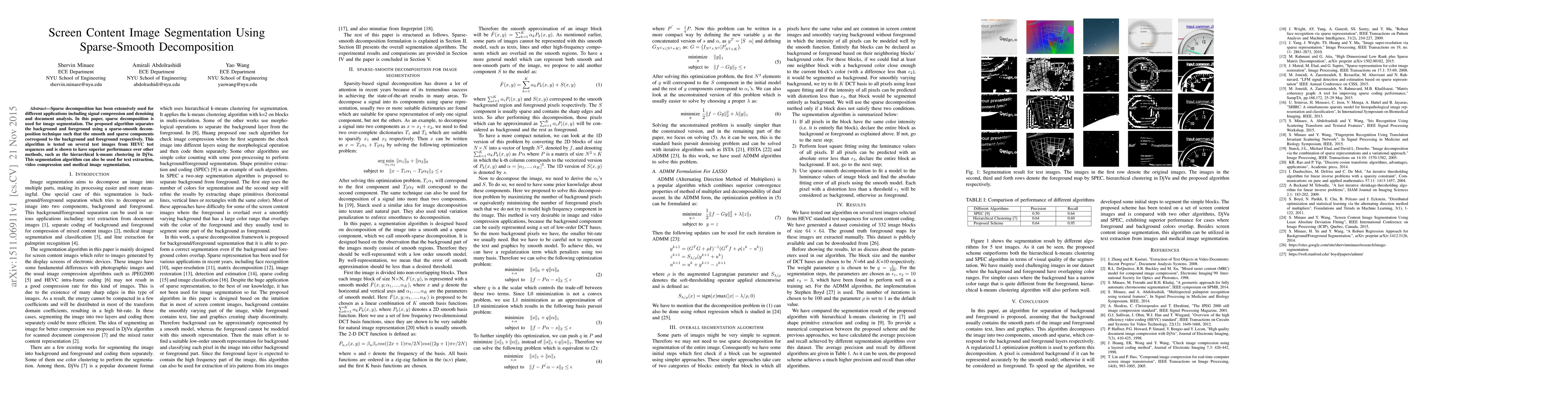 This paper proposes a sparse-smooth decomposition technique for image segmentation, effectively separating background and foreground. The algorithm outperforms hierarchical k-means clustering and has potential applications in text extraction, video compression, and medical image segmentation.