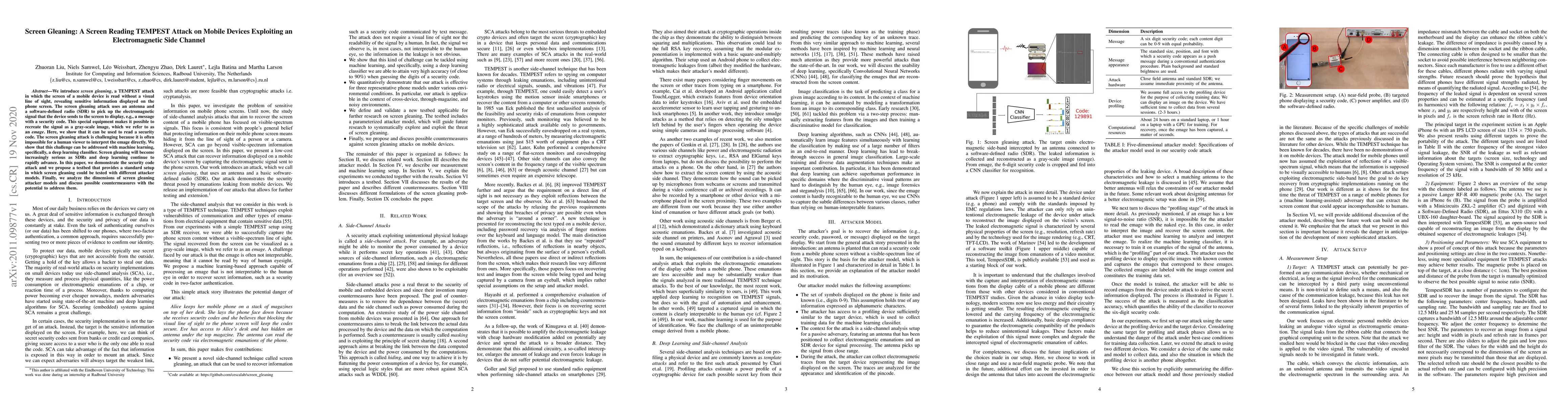 This paper introduces "screen gleaning," a TEMPEST attack exploiting electromagnetic signals to read mobile device screens without visual access, using an antenna and SDR to recreate gray-scale images. It proposes a deep learning classifier to interpret these images and suggests countermeasures against this emerging threat.