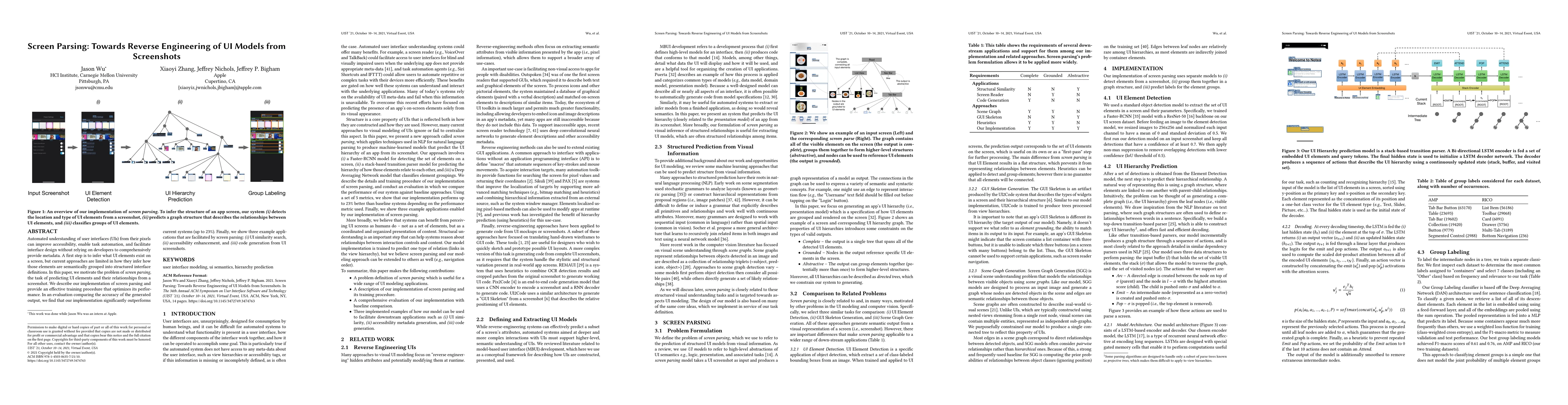 This paper proposes a method for screen parsing to reverse engineer UI models from screenshots, aiming to improve accessibility, automate tasks, and aid design. It introduces an effective training procedure that outperforms existing systems by up to 23%, and demonstrates applications in UI similarity search, accessibility enhancement, and code generation from screenshots.