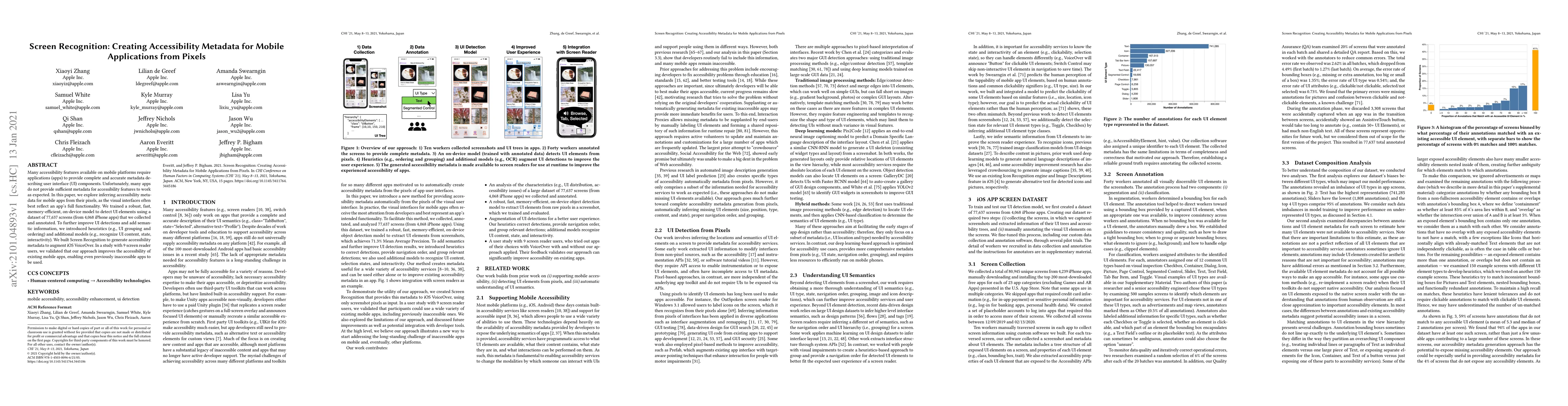 This paper presents a method to infer accessibility metadata for mobile apps from pixel data, aiming to improve app usability for users with disabilities. The authors developed a model trained on a large dataset of app screens to detect UI elements and introduced heuristics and additional models to enhance metadata generation, ultimately augmenting iOS VoiceOver and improving accessibility for screen reader users.