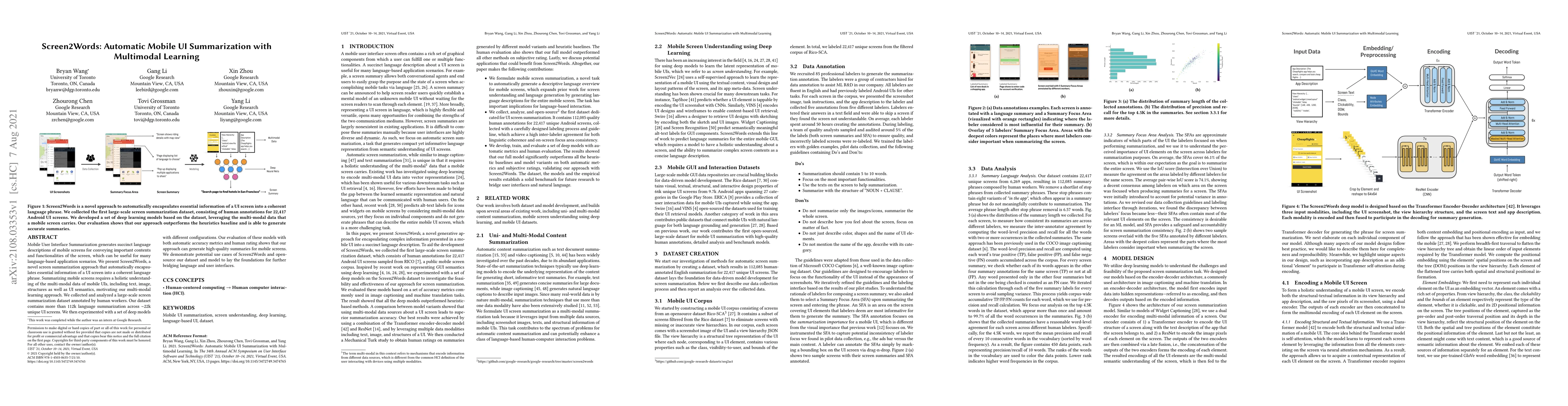 Screen2Words is an innovative approach for automatic mobile UI summarization using multi-modal learning to generate succinct language descriptions of mobile screens. The method was evaluated on a large-scale dataset of over 112k summaries across 22k unique UI screens, demonstrating high-quality summarization performance.
