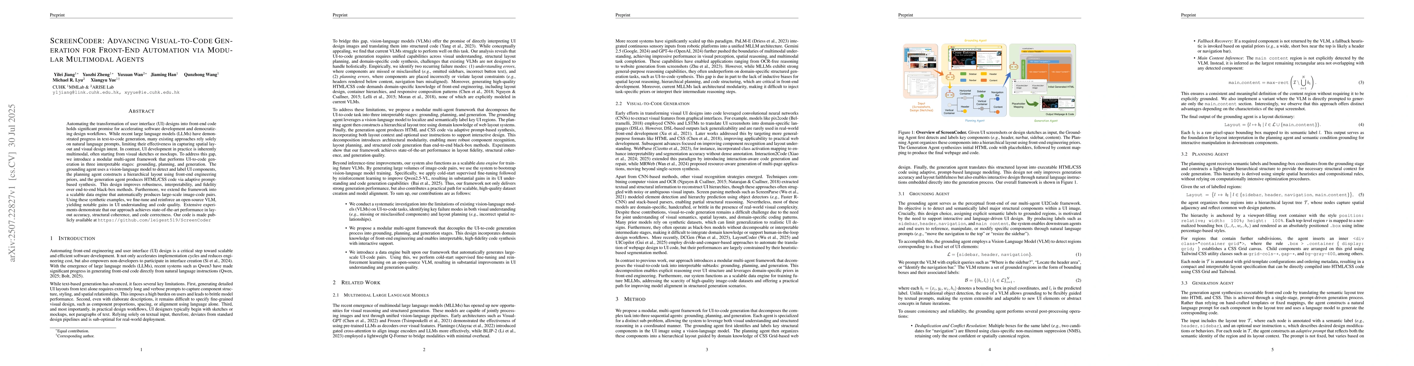 The research introduces ScreenCoder, a modular multi-agent framework for transforming UI designs into front-end code. It consists of three stages: grounding for UI component detection, planning for hierarchical layout, and generation for code synthesis. This approach outperforms black-box methods, enhancing robustness, interpretability, and fidelity. The framework is also extended into a scalable data engine for automatic image-code pair production, significantly improving UI understanding and code quality. The method achieves state-of-the-art results in layout accuracy, structural coherence, and code correctness.