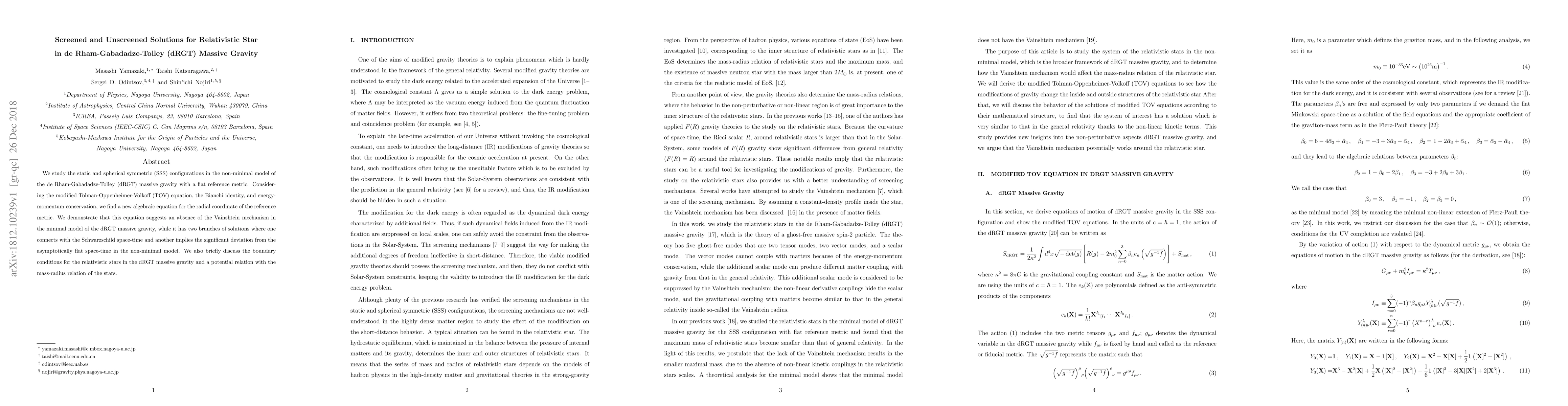 We study the static and spherical symmetric (SSS) configurations in the non-minimal model of the de Rham-Gabadadze-Tolley (dRGT) massive gravity with a flat reference metric. Considering the modified Tolman-Oppenheimer-Volkoff (TOV) equation, the Bianchi identity, and energy-momentum conservation, we find a new algebraic equation for the radial coordinate of the reference metric. We demonstrate that this equation suggests an absence of the Vainshtein mechanism in the minimal model of the dRGT massive gravity, while it has two branches of solutions where one connects with the Schwarzschild space-time and another implies the significant deviation from the asymptotically flat space-time in the non-minimal model. We also briefly discuss the boundary conditions for the relativistic stars in the dRGT massive gravity and a potential relation with the mass-radius relation of the stars.