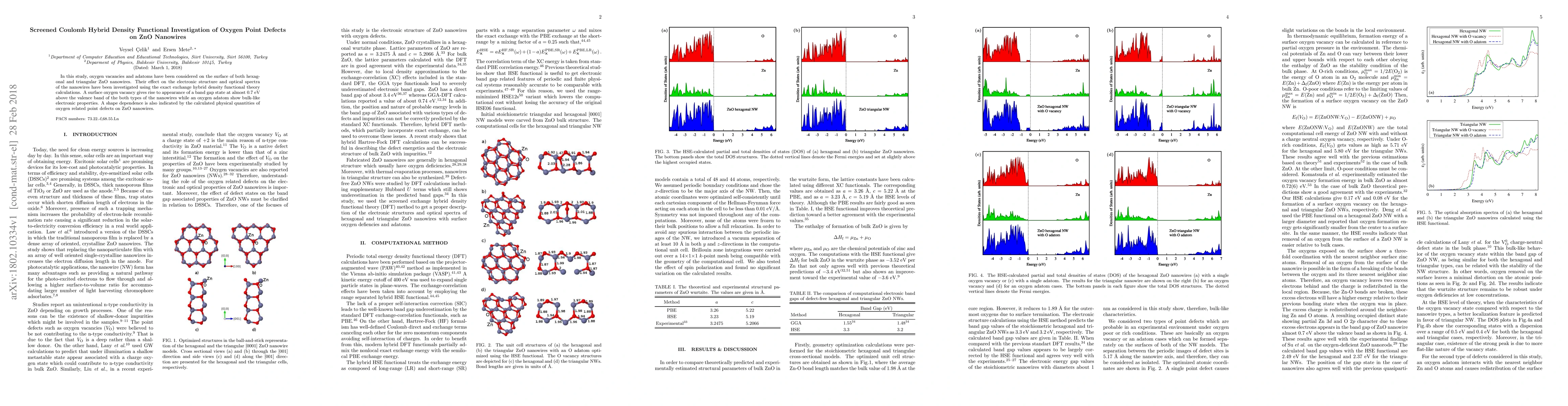 This study investigates the impact of oxygen vacancies and adatoms on the electronic structure and optical spectra of hexagonal and triangular ZnO nanowires using hybrid density functional theory. Oxygen vacancies create a band gap state at 0.7 eV above the valence band, while oxygen adatoms exhibit bulk-like properties, revealing a shape-dependent effect on the nanowires.
