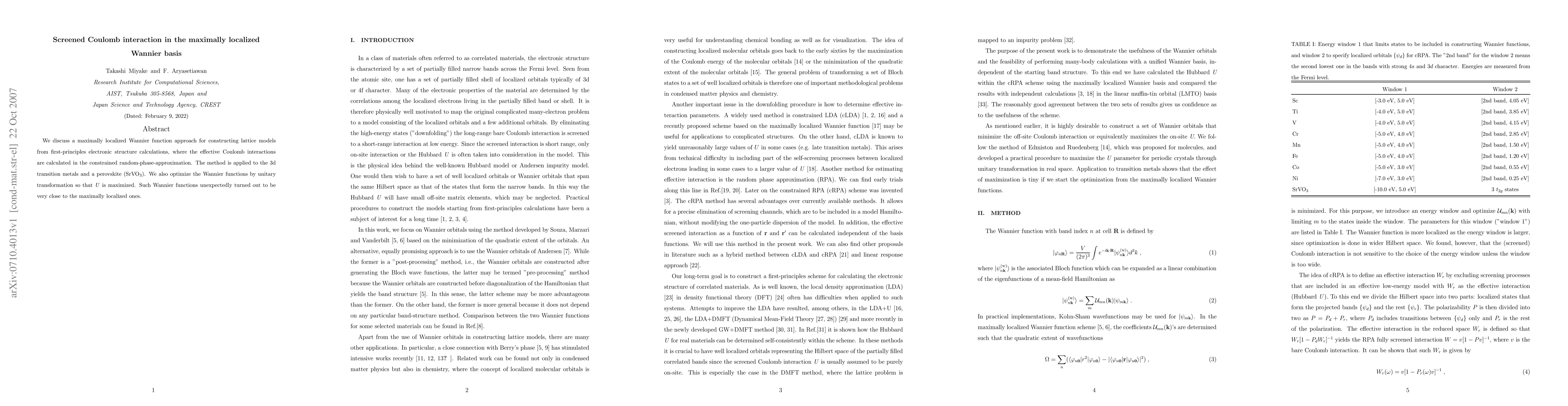 We discuss a maximally localized Wannier function approach for constructing lattice models from first-principles electronic structure calculations, where the effective Coulomb interactions are calculated in the constrained random-phase-approximation. The method is applied to the 3d transition metals and a perovskite (SrVO_3). We also optimize the Wannier functions by unitary transformation so that U is maximized. Such Wannier functions unexpectedly turned out to be very close to the maximally localized ones.