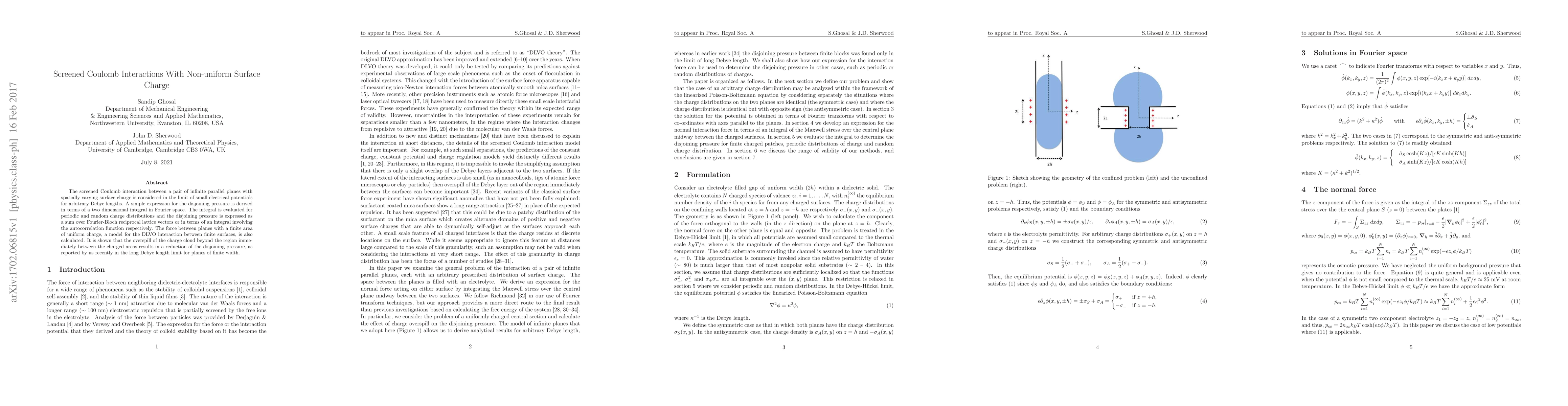 Researchers derived a simple expression for disjoining pressure between infinite parallel planes with varying surface charge, showing reduced pressure due to overspill of the charge cloud beyond charged areas.