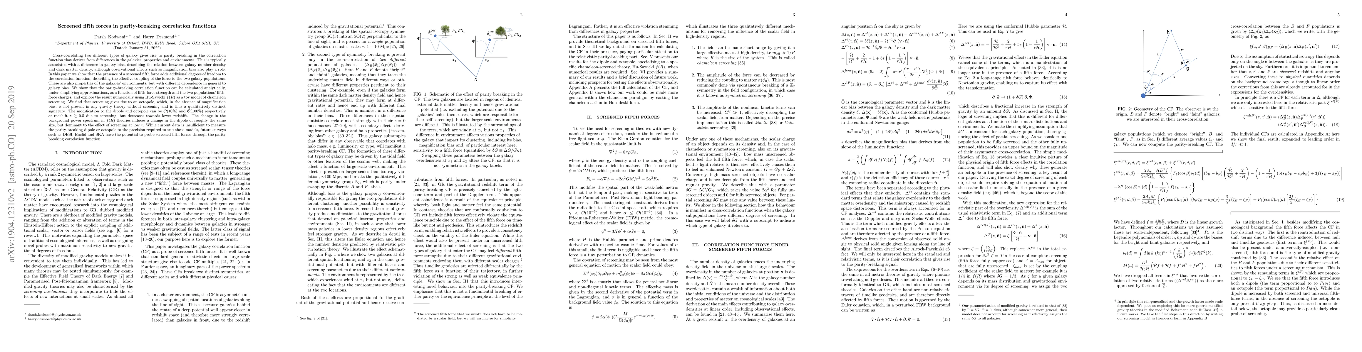 This paper investigates how screened fifth forces affect parity-breaking correlation functions between different galaxy types, revealing an octopole signature absent in non-screened theories. The study finds that screening can modify the dipole and octopole by $\mathcal{O}(10\%)$ and $\mathcal{O}(100\%)$ respectively at higher redshifts, though effects diminish at lower redshifts. Future surveys may test these models through the dipole.