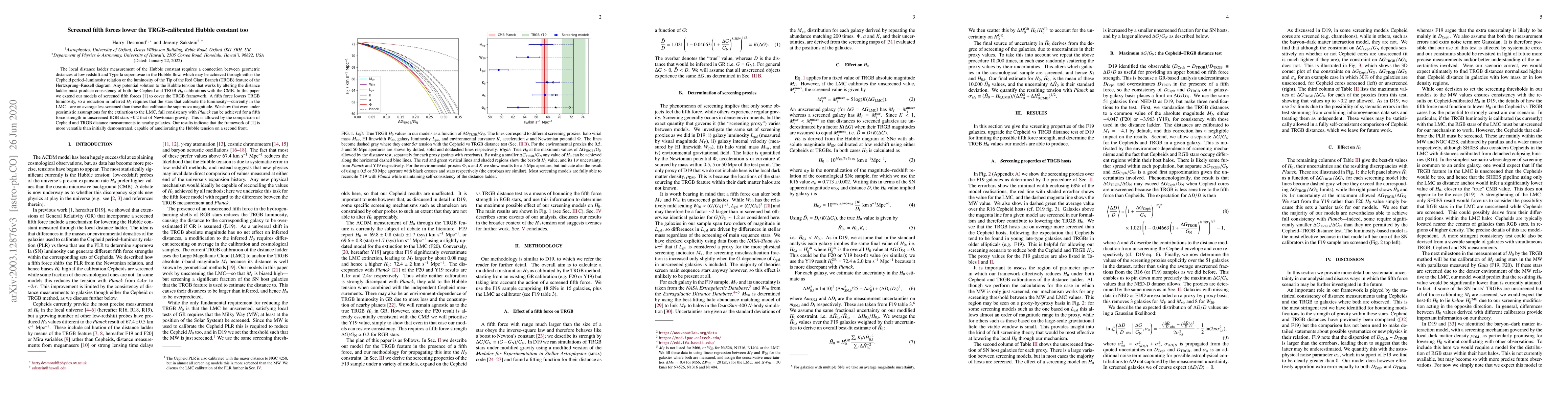 The local distance ladder measurement of the Hubble constant requires a connection between geometric distances at low redshift and Type Ia supernovae in the Hubble flow, which may be achieved through either the Cepheid period--luminosity relation or the luminosity of the Tip of the Red Giant Branch (TRGB) feature of the Hertzsprung--Russell diagram. Any potential solution to the Hubble tension that works by altering the distance ladder must produce consistency of both the Cepheid and TRGB $H_0$ calibrations with the CMB. In this paper we extend our models of screened fifth forces (Desmond et al 2019) to cover the TRGB framework. A fifth force lowers TRGB luminosity, so a reduction in inferred $H_0$ requires that the stars that calibrate the luminosity---currently in the LMC---are on average less screened than those that calibrate the supernova magnitude. We show that even under pessimistic assumptions for the extinction to the LMC, full consistency with Planck can be achieved for a fifth force strength in unscreened RGB stars $\sim$0.2 that of Newtonian gravity. This is allowed by the comparison of Cepheid and TRGB distance measurements to nearby galaxies. Our results indicate that the framework of Desmond et al (2019) is more versatile than initially demonstrated, capable of ameliorating the Hubble tension on a second front.