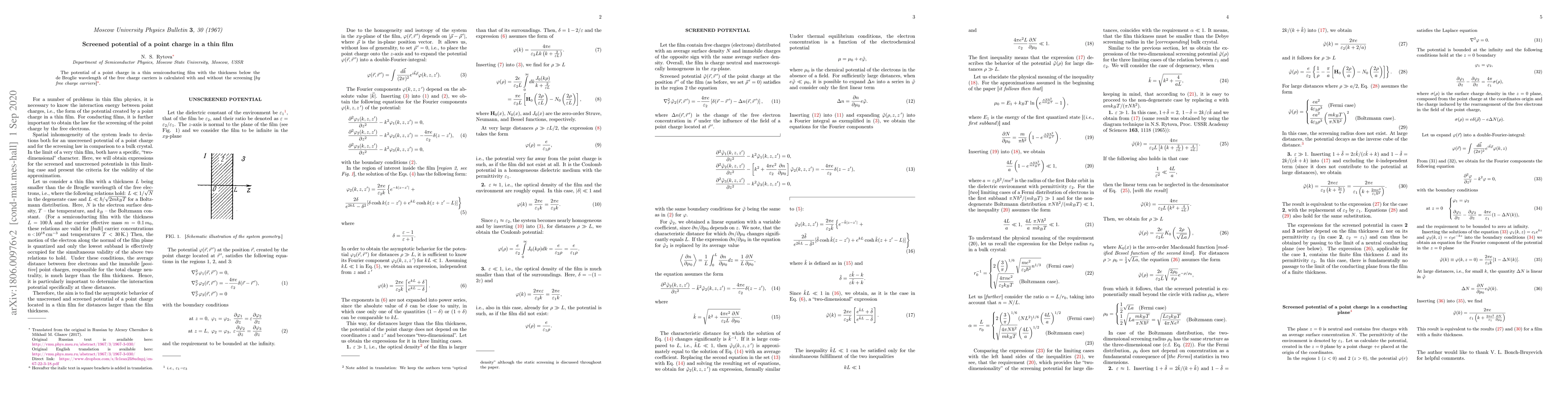The potential of a point charge in a thin semiconducting film with the thickness below the de Broglie wavelength of the free charge carriers is calculated with and without the screening.