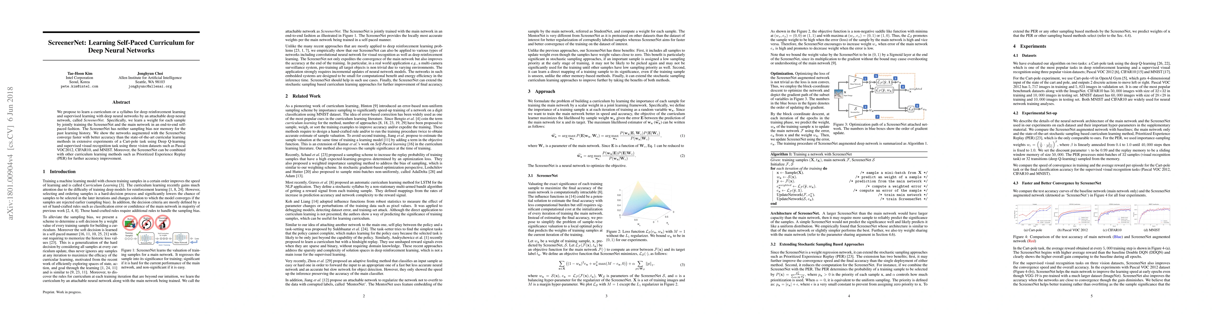 ScreenerNet is an attachable deep neural network that learns a self-paced curriculum for both supervised and reinforcement learning, enabling early convergence and better accuracy. It achieves superior performance compared to state-of-the-art methods across vision datasets and a reinforcement learning task.