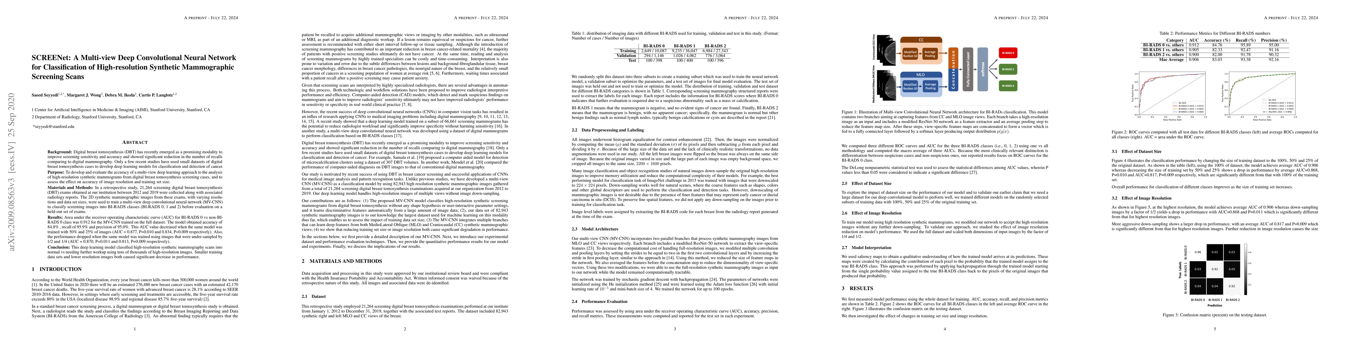 SCREENet, a multi-view deep convolutional neural network, accurately classifies high-resolution synthetic mammograms from digital breast tomosynthesis, achieving an AUC of 0.912. Performance declines with reduced training set size and lower image resolution.