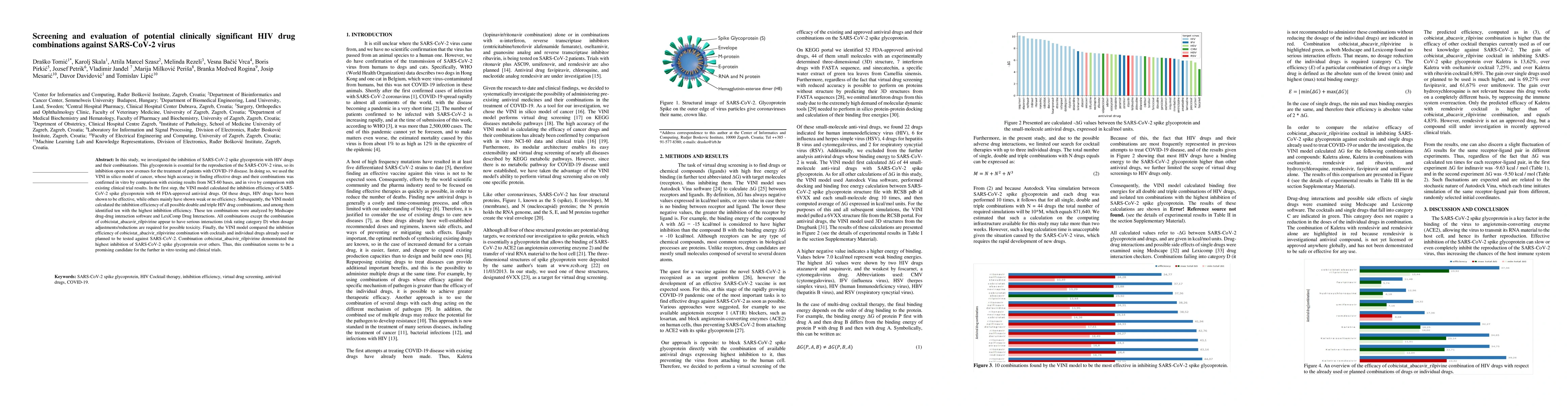 In this study, we investigated the inhibition of SARS-CoV-2 spike glycoprotein with HIV drugs and their combinations. This glycoprotein is essential for the reproduction of the SARS-COV-2 virus, so its inhibition opens new avenues for the treatment of patients with COVID-19 disease. In doing so, we used the VINI in silico model of cancer, whose high accuracy in finding effective drugs and their combinations was confirmed in vitro by comparison with existing results from NCI-60 bases, and in vivo by comparison with existing clinical trial results. In the first step, the VINI model calculated the inhibition efficiency of SARS-CoV-2 spike glycoprotein with 44 FDA-approved antiviral drugs. Of these drugs, HIV drugs have been shown to be effective, while others mainly have shown weak or no efficiency. Subsequently, the VINI model calculated the inhibition efficiency of all possible double and triple HIV drug combinations, and among them identified ten with the highest inhibition efficiency. These ten combinations were analyzed by Medscape drug-drug interaction software and LexiComp Drug Interactions. All combinations except the combination of cobicistat_abacavir_rilpivirine appear to have serious interactions (risk rating category D) when dosage adjustments/reductions are required for possible toxicity. Finally, the VINI model compared the inhibition efficiency of cobicistat_abacivir_rilpivirine combination with cocktails and individual drugs already used or planned to be tested against SARS-CoV-2. Combination cobicistat_abacivir_rilpivirine demonstrated the highest inhibition of SARS-CoV-2 spike glycoprotein over others. Thus, this combination seems to be a promising candidate for the further in vitro testing and clinical trials.