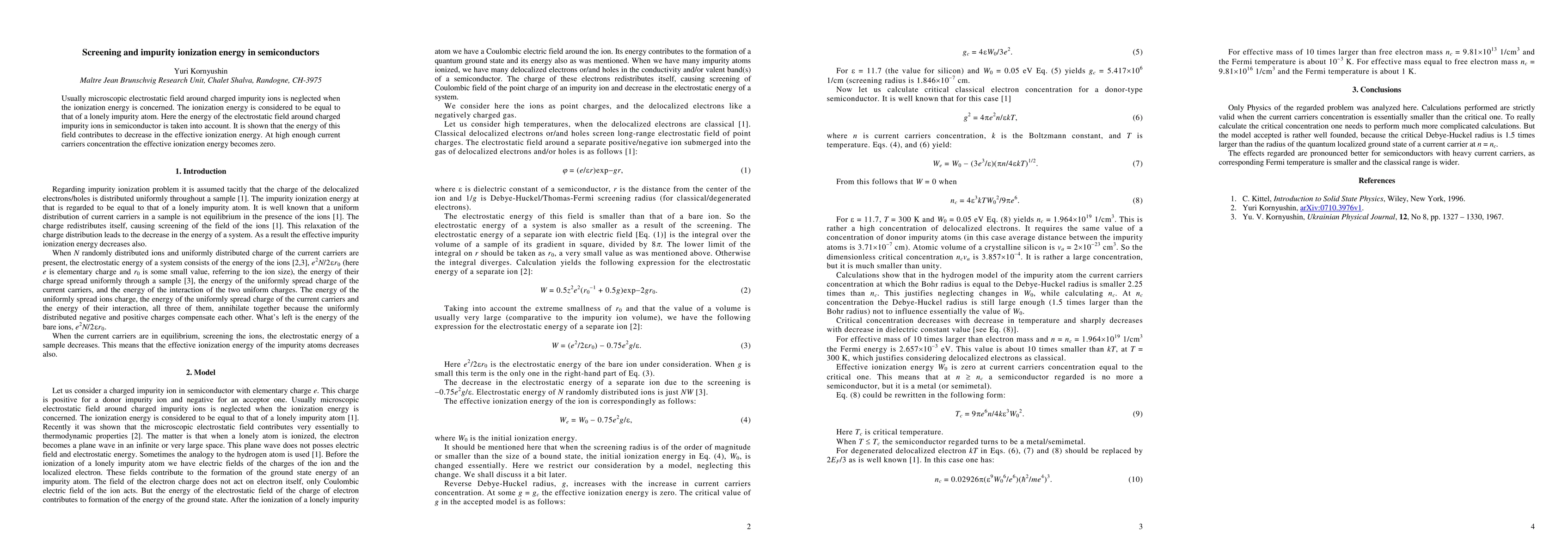 Research shows that neglecting electrostatic fields around charged impurity ions in semiconductors underestimates ionization energy, which decreases with high carrier concentration to eventually reach zero.