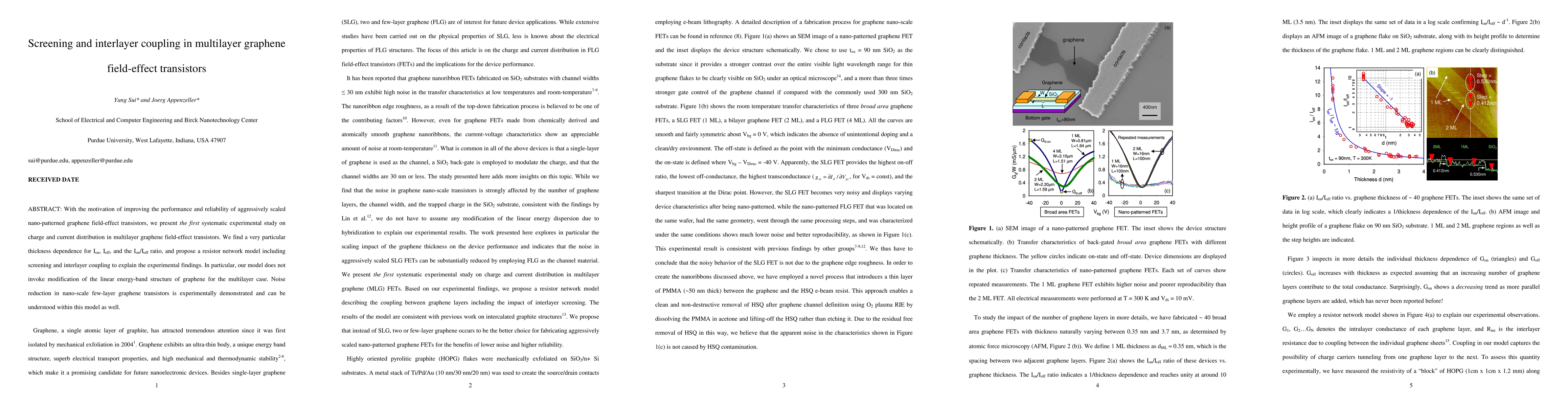 With the motivation of improving the performance and reliability of aggressively scaled nano-patterned graphene field-effect transistors, we present the first systematic experimental study on charge and current distribution in multilayer graphene field-effect transistors. We find a very particular thickness dependence for Ion, Ioff, and the Ion/Ioff ratio, and propose a resistor network model including screening and interlayer coupling to explain the experimental findings. In particular, our model does not invoke modification of the linear energy-band structure of graphene for the multilayer case. Noise reduction in nano-scale few-layer graphene transistors is experimentally demonstrated and can be understood within this model as well.