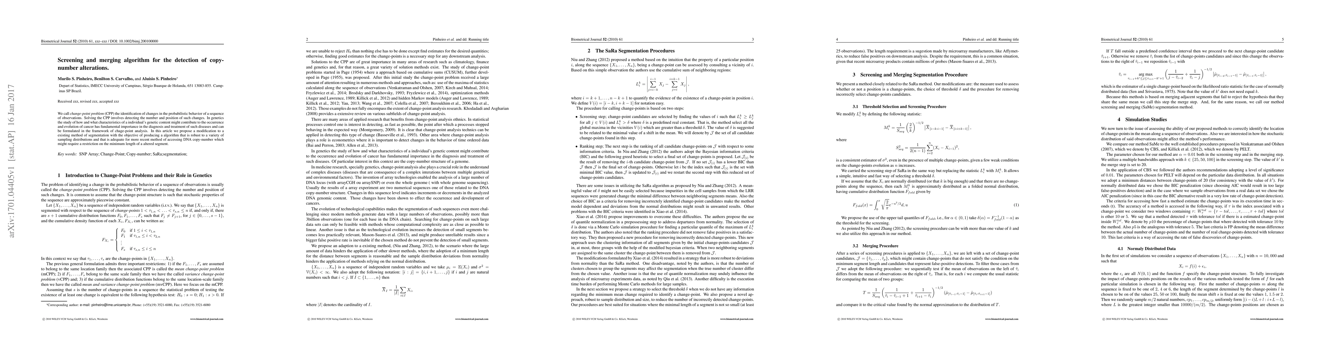 We call change-point problem (CPP) the identification of changes in the probabilistic behavior of a sequence of observations. Solving the CPP involves detecting the number and position of such changes. In genetics the study of how and what characteristics of a individual's genetic content might contribute to the occurrence and evolution of cancer has fundamental importance in the diagnosis and treatment of such diseases and can be formulated in the framework of chage-point analysis. In this article we propose a modification to a existing method of segmentation with the objective of producing a algorithm that is robust to a variety of sampling distributions and that is adequate for more recent method of accessing DNA copy-number which might require a restriction on the minimum length of a altered segment.