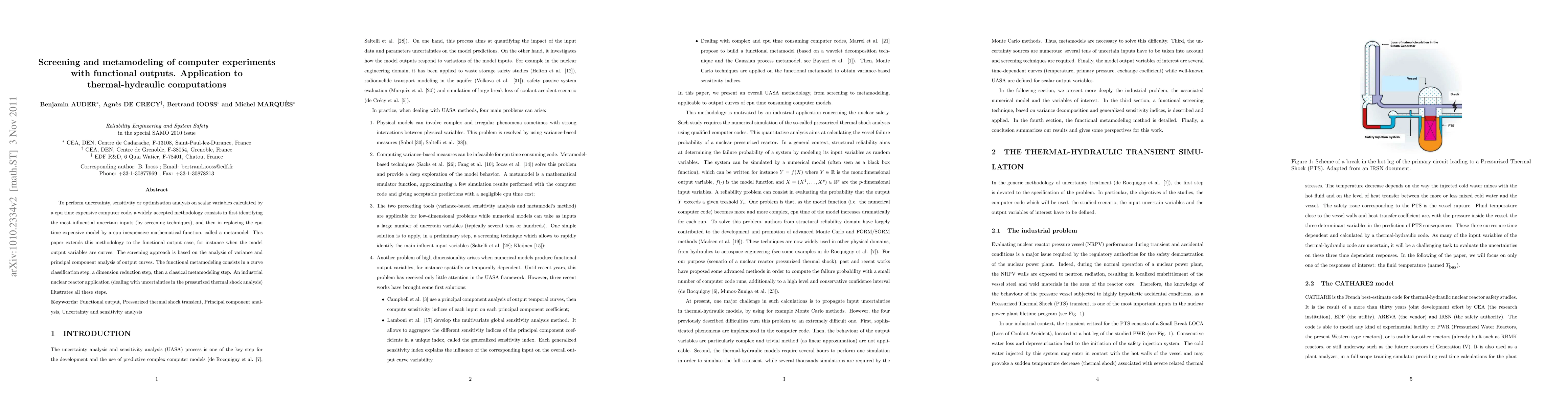 This paper proposes a methodology for screening and metamodeling computer experiments with functional outputs, extending traditional techniques to handle model outputs as curves. It employs analysis of variance and principal component analysis for screening, followed by curve classification and dimension reduction before constructing a metamodel, demonstrated through an application in thermal-hydraulic computations for nuclear reactor safety analysis.