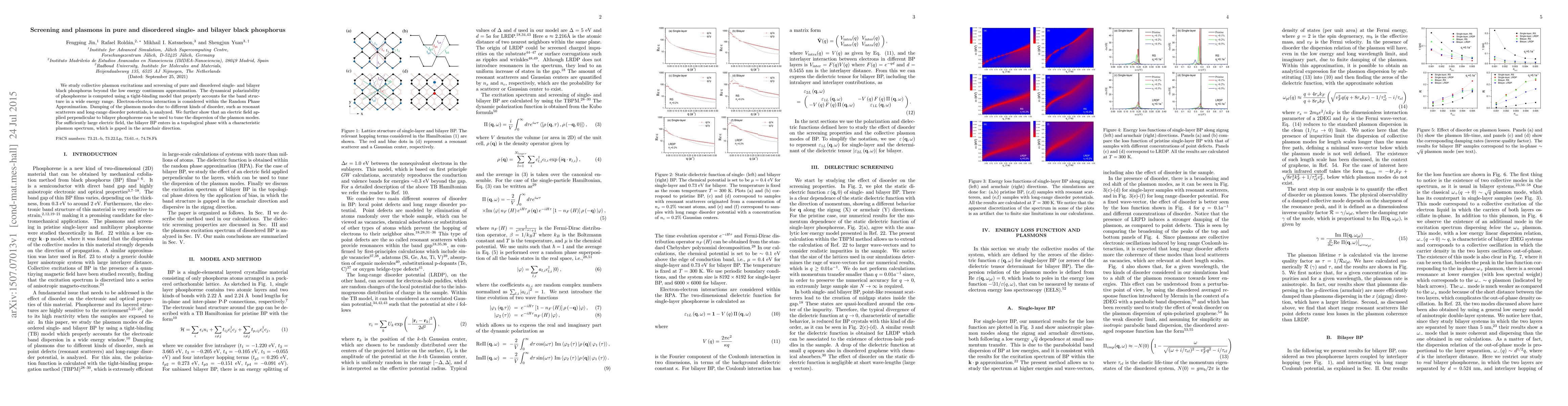 This paper investigates collective plasmon excitations and screening in single- and bilayer black phosphorus, using a tight-binding model to account for band structure. It analyzes damping due to various disorder types and demonstrates that an electric field perpendicular to bilayer phosphorene can tune plasmon dispersion, leading to a topological phase with a gaped plasmon spectrum.