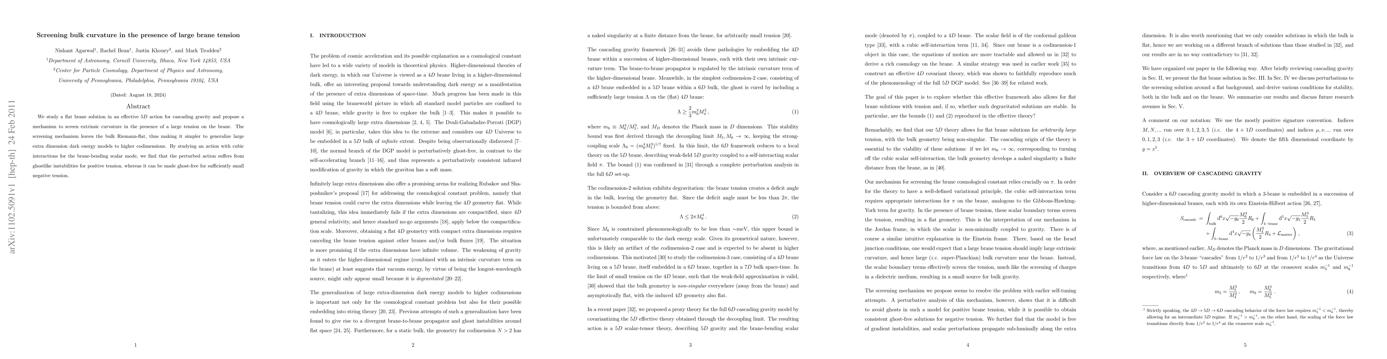 We study a flat brane solution in an effective 5D action for cascading gravity and propose a mechanism to screen extrinsic curvature in the presence of a large tension on the brane. The screening mechanism leaves the bulk Riemann-flat, thus making it simpler to generalize large extra dimension dark energy models to higher codimensions. By studying an action with cubic interactions for the brane-bending scalar mode, we find that the perturbed action suffers from ghostlike instabilities for positive tension, whereas it can be made ghost-free for sufficiently small negative tension.