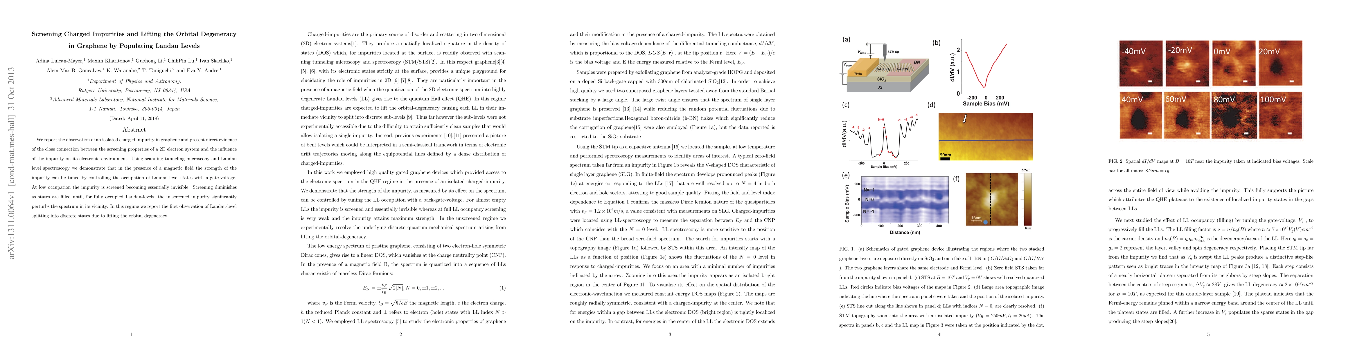 This paper demonstrates that charged impurities in graphene can be screened by tuning the occupation of Landau levels with a gate-voltage, revealing a direct link between impurity screening and electronic environment. It also reports the first observation of Landau-level splitting into discrete states due to lifting orbital degeneracy when Landau levels are fully occupied.