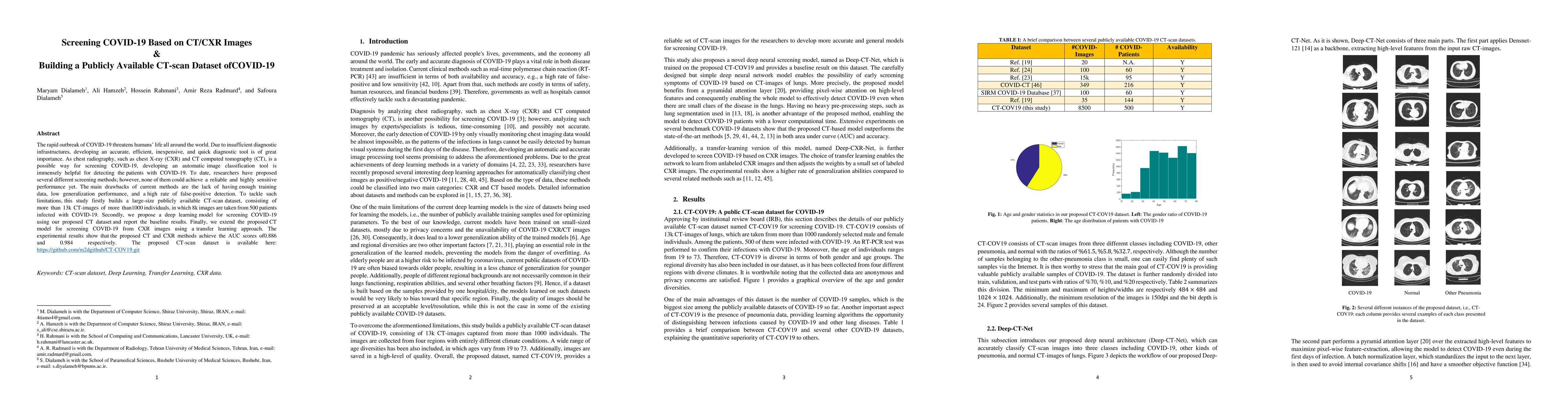This study develops a publicly available CT-scan dataset of over 13,000 images from 1,000 individuals, including 8,000 images from 500 COVID-19 patients, to improve the diagnostic accuracy of COVID-19 screening. It proposes a deep learning model achieving an AUC score of 0.886 for CT images and 0.984 for CXR images using transfer learning.