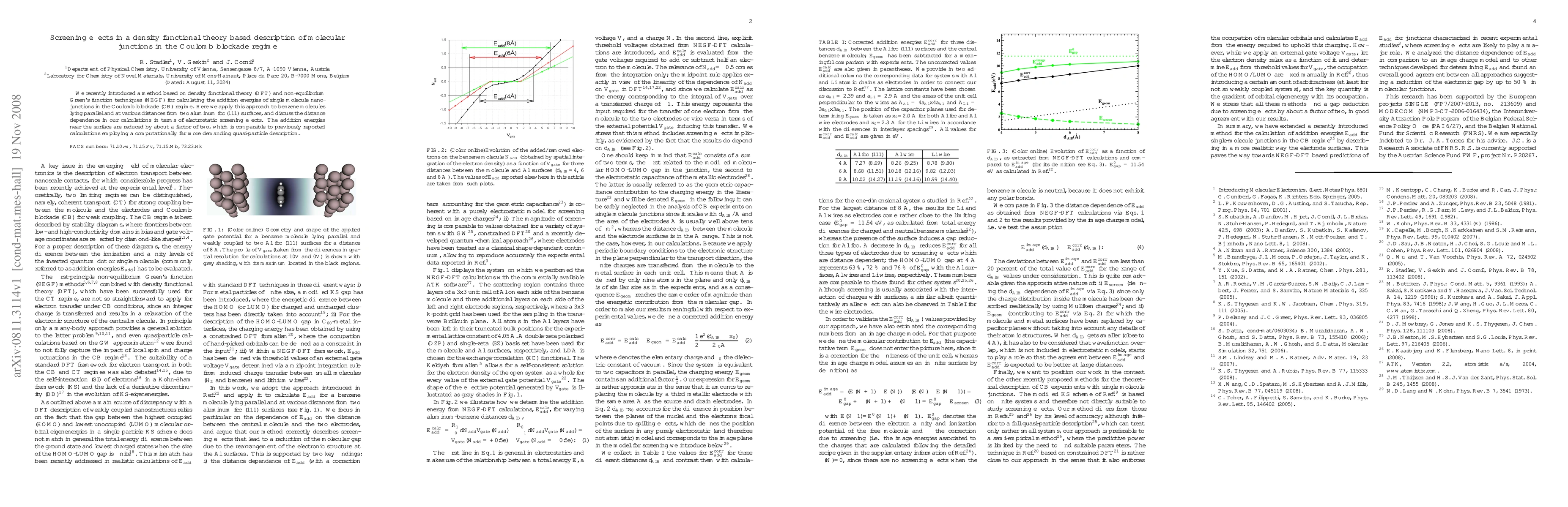 This paper applies a DFT-based method to study benzene molecules near aluminum surfaces in the Coulomb blockade regime, finding that addition energies are halved due to electrostatic screening effects, comparable to more complex quasi-particle calculations. The study highlights the effectiveness of DFT in modeling molecular junctions.