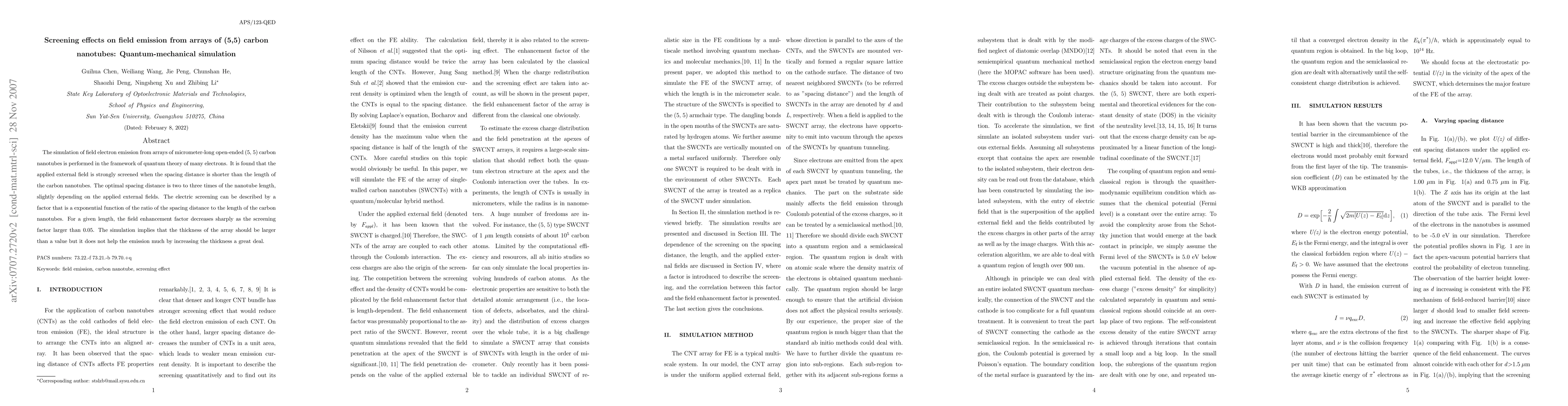 This paper uses quantum-mechanical simulations to study field electron emission from arrays of (5,5) carbon nanotubes, finding that strong screening occurs when tube spacing is less than the tube length. The optimal spacing is two to three times the tube length, with electric screening described by an exponential function of the spacing-to-length ratio.