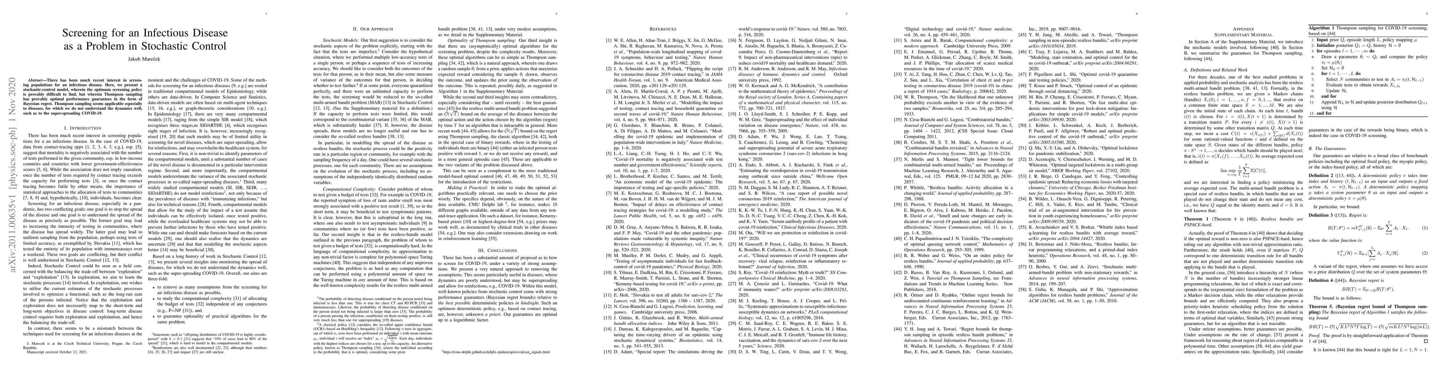 There has been much recent interest in screening populations for an infectious disease. Here, we present a stochastic-control model, wherein the optimum screening policy is provably difficult to find, but wherein Thompson sampling has provably optimal performance guarantees in the form of Bayesian regret. Thompson sampling seems applicable especially to diseases, for which we do not understand the dynamics well, such as to the super-spreading COVID-19.