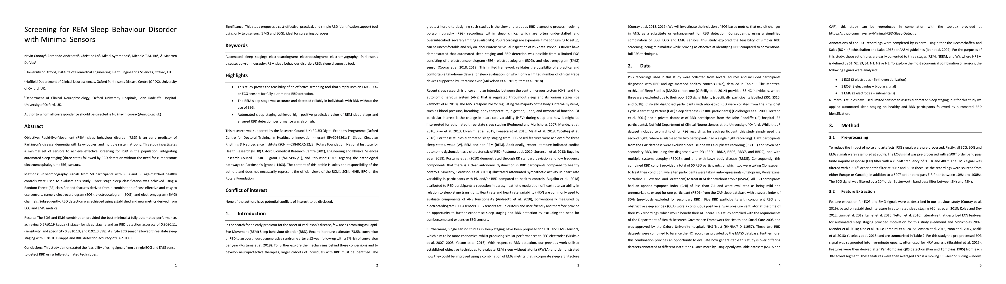 This study explores a cost-effective, minimally invasive method for screening REM Sleep Behaviour Disorder (RBD) using a combination of electrooculogram (EOG) and electromyogram (EMG) sensors, achieving high accuracy in RBD detection and three-stage sleep classification. The proposed tool offers a practical alternative to traditional EEG-based methods.