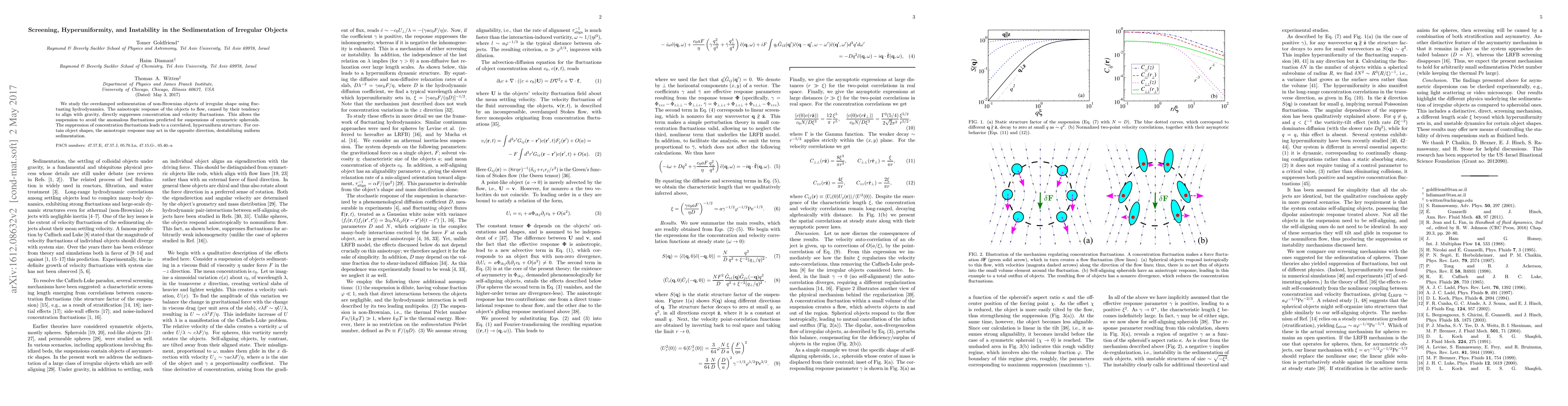This paper investigates the sedimentation of irregularly shaped objects under gravity, revealing that their anisotropic alignment suppresses concentration and velocity fluctuations, leading to a hyperuniform structure. However, for certain shapes, this alignment can destabilize uniform sedimentation.