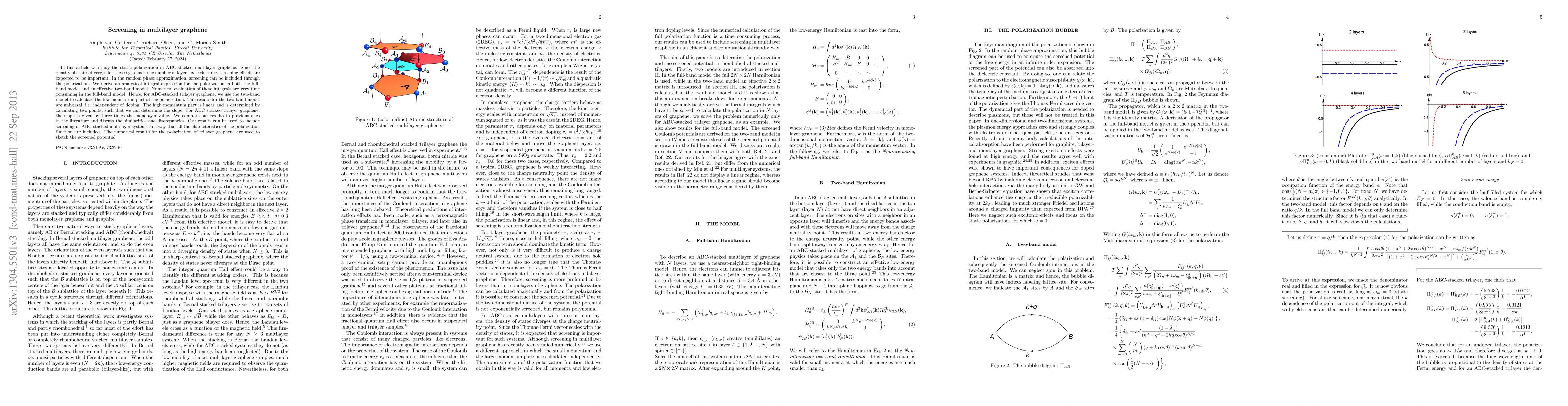 In this article we study the static polarization in ABC-stacked multilayer graphene. Since the density of states diverges for these systems if the number of layers exceeds three, screening effects are expected to be important. In the random phase approximation, screening can be included through the polarization. We derive an analytical integral expression for the polarization in both the full-band model and an effective two-band model. Numerical evaluation of these integrals are very time consuming in the full-band model. Hence, for ABC-stacked trilayer graphene, we use the two-band model to calculate the low momentum part of the polarization. The results for the two-band model are universal, i.e. independent of doping. The high momentum part is linear and is determined by calculating two points, such that we can determine the slope. For ABC stacked trilayer graphene, the slope is given by three times the monolayer value. We compare our results to previous ones in the literature and discuss the similarities and discrepancies. Our results can be used to include screening in ABC-stacked multilayer systems in a way that all the characteristics of the polarization function are included. The numerical results for the polarization of trilayer graphene are used to sketch the screened potential.