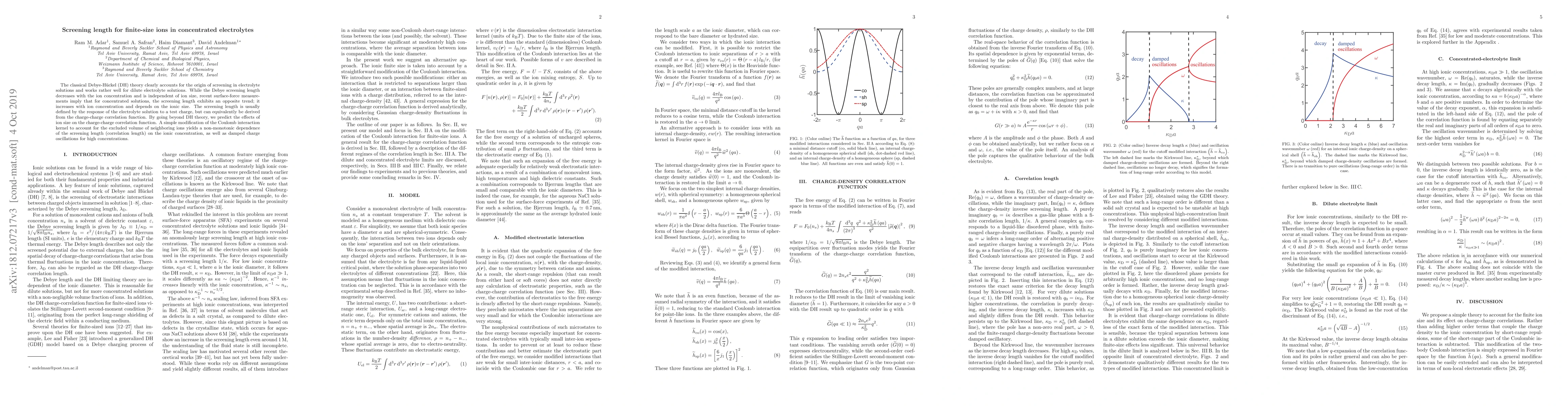 This paper extends classical Debye-Huckel theory to predict the effects of finite-size ions on screening length in concentrated electrolytes, showing that the screening length increases with ion concentration and depends on ionic size, contrary to predictions for dilute solutions. The modified Coulomb interaction kernel accounts for excluded volume, leading to non-monotonic concentration dependence and damped charge oscillations.
