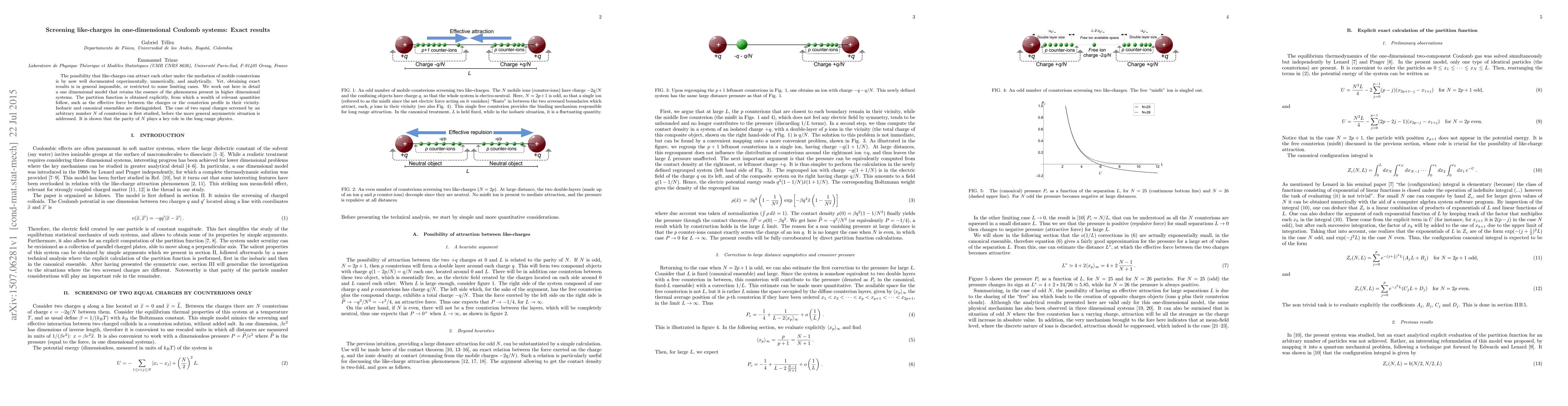 Researchers developed a 1D model to study like-charges attraction via mobile counterions, providing exact results for specific cases and highlighting the role of parity in long-range physics.
