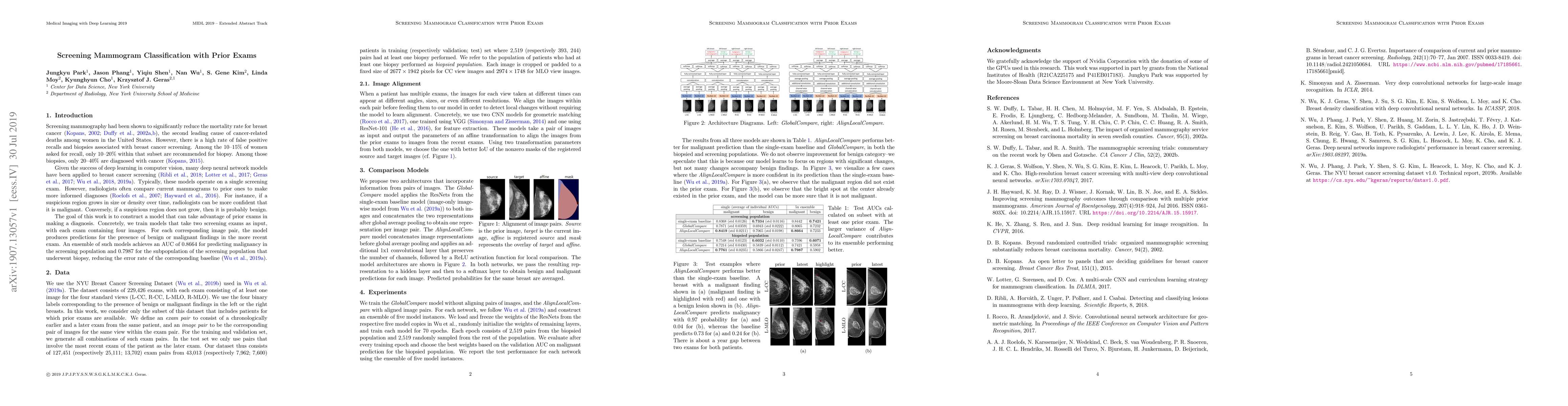 Radiologists typically compare a patient's most recent breast cancer screening exam to their previous ones in making informed diagnoses. To reflect this practice, we propose new neural network models that compare pairs of screening mammograms from the same patient. We train and evaluate our proposed models on over 665,000 pairs of images (over 166,000 pairs of exams). Our best model achieves an AUC of 0.866 in predicting malignancy in patients who underwent breast cancer screening, reducing the error rate of the corresponding baseline.