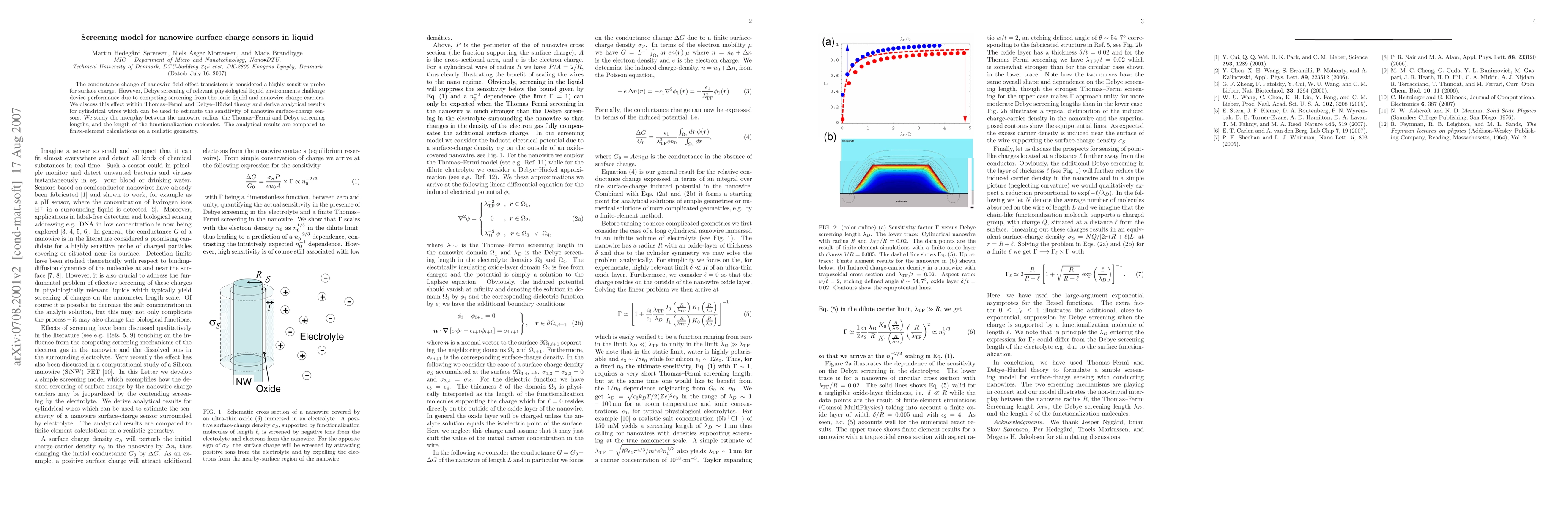 This paper develops a screening model for nanowire surface-charge sensors in liquid, analyzing conductance changes in nanowire field-effect transistors under physiological liquid environments. The study uses Thomas-Fermi and Debye-Huckel theories to derive analytical results for cylindrical nanowires, comparing them with finite-element calculations to assess sensor sensitivity.