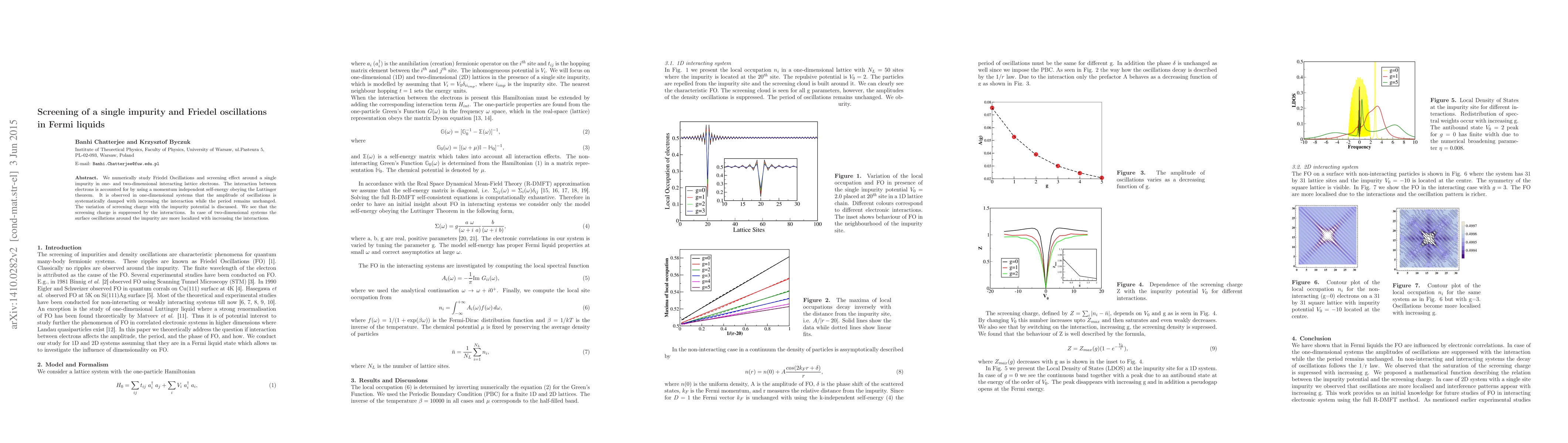 This paper numerically investigates Friedel oscillations and screening effects around a single impurity in interacting lattice electrons, finding that in one-dimensional systems, interaction dampens oscillation amplitude while preserving period, and that screening charge is reduced by interactions. In two-dimensional systems, increased interactions localize surface oscillations around the impurity.