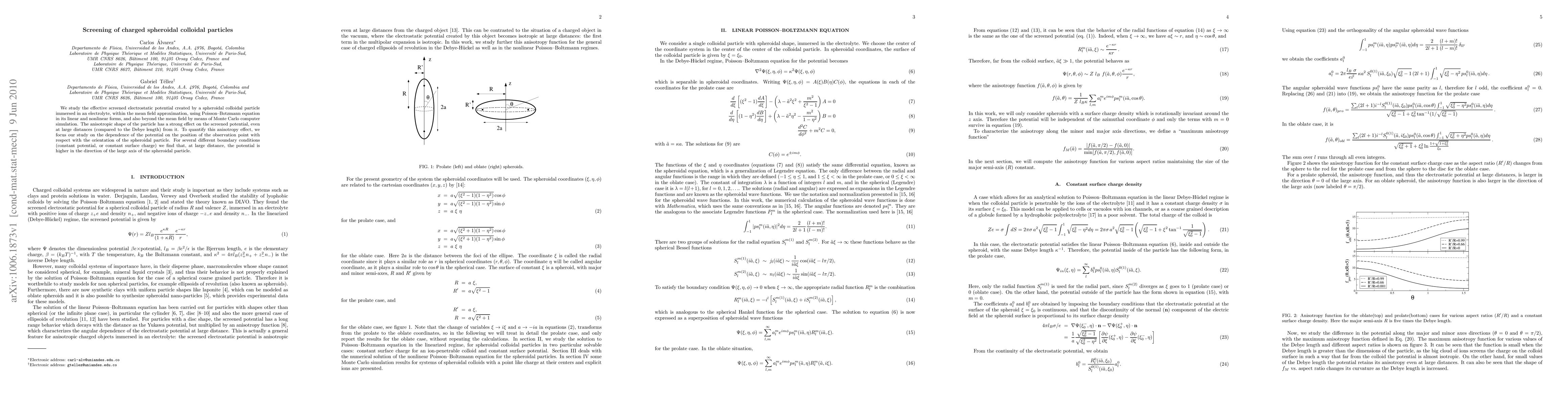 A study on charged spheroidal colloidal particles found that the screened electrostatic potential varies greatly depending on the particle's orientation, with higher potentials in the direction of its large axis at large distances.