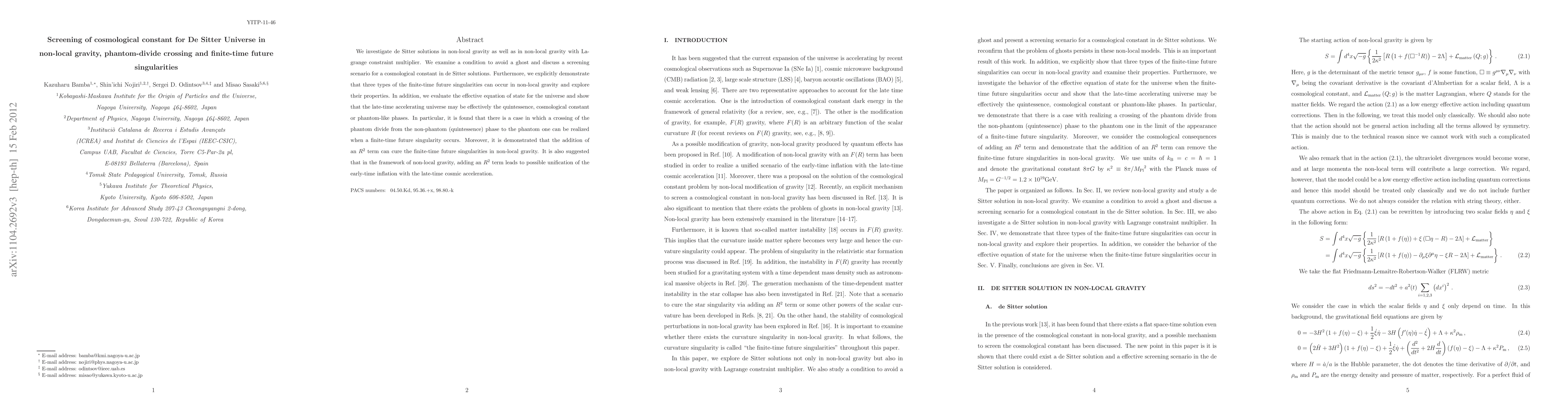 This paper examines de Sitter solutions in non-local gravity, exploring conditions to avoid ghosts and proposing a screening mechanism for the cosmological constant. It also investigates finite-time future singularities in non-local gravity, finding they can lead to phantom-divide crossings, and suggests that including an $R^2$ term can mitigate these singularities and unify early inflation with late-time cosmic acceleration.