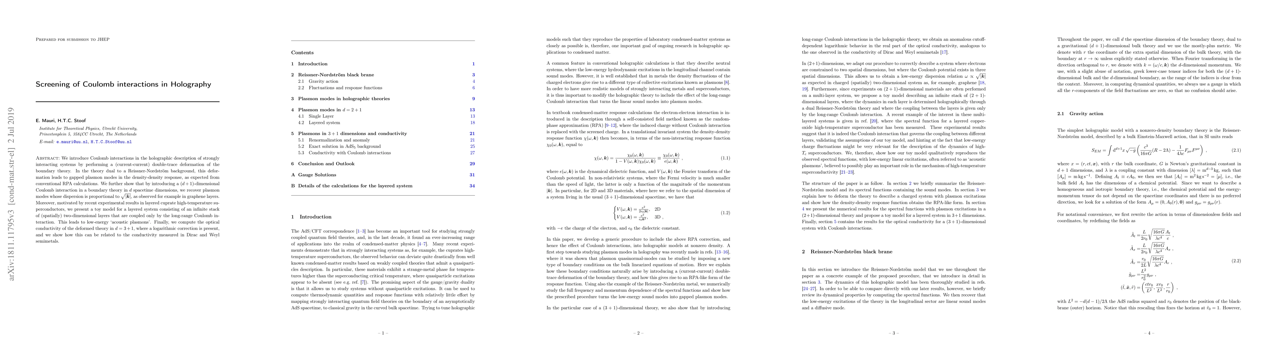 This paper explores the introduction of Coulomb interactions in holographic models of strongly interacting systems, demonstrating gapped plasmon modes and acoustic plasmons in layered systems. It also computes the optical conductivity with a logarithmic correction, linking it to observations in Dirac and Weyl semimetals.