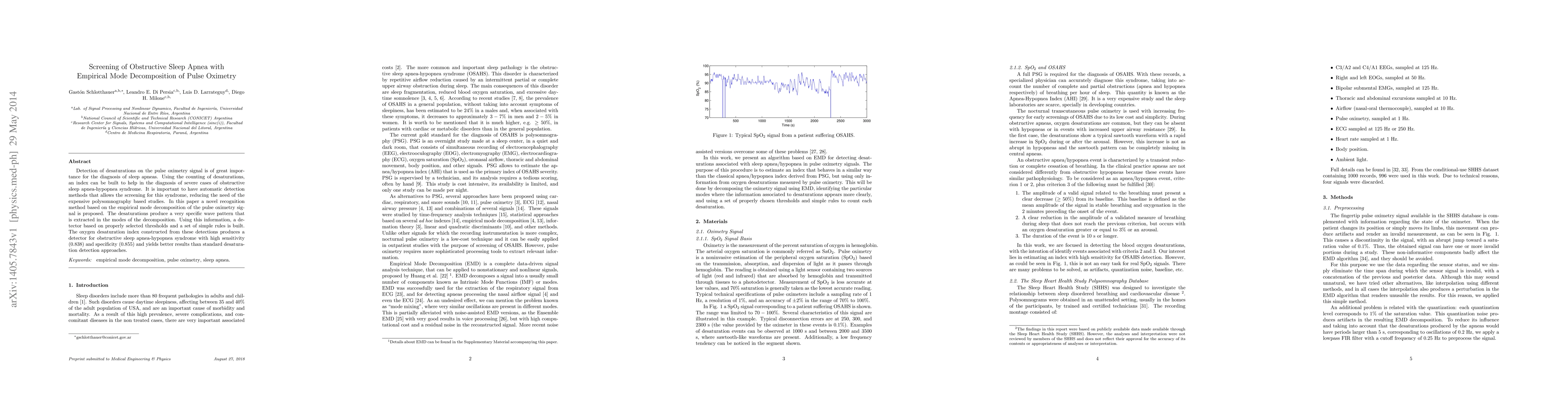 This paper proposes a novel method using empirical mode decomposition to automatically screen for obstructive sleep apnea-hypopnea syndrome by detecting desaturations from pulse oximetry signals, achieving high sensitivity and specificity, and outperforming standard detection approaches.