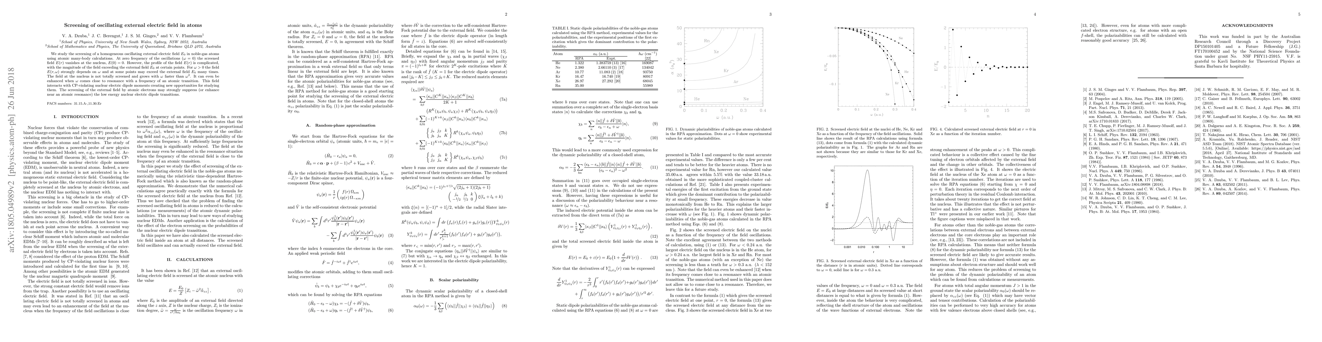 This paper investigates the screening of oscillating external electric fields in noble-gas atoms by atomic many-body calculations. At non-zero frequencies, the screened field can significantly exceed the external field, especially near atomic resonance frequencies, impacting CP-violating nuclear electric dipole moments.