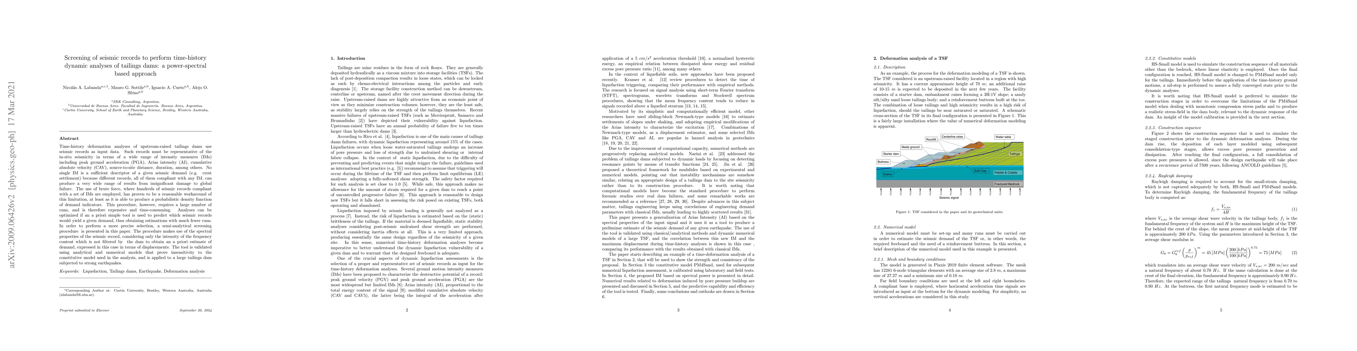 This paper proposes a power-spectral based approach for screening seismic records to optimize time-history dynamic analyses of tailings dams. The method leverages spectral properties to predict seismic demand without filtering, aiming to reduce the number of costly and time-consuming analyses.