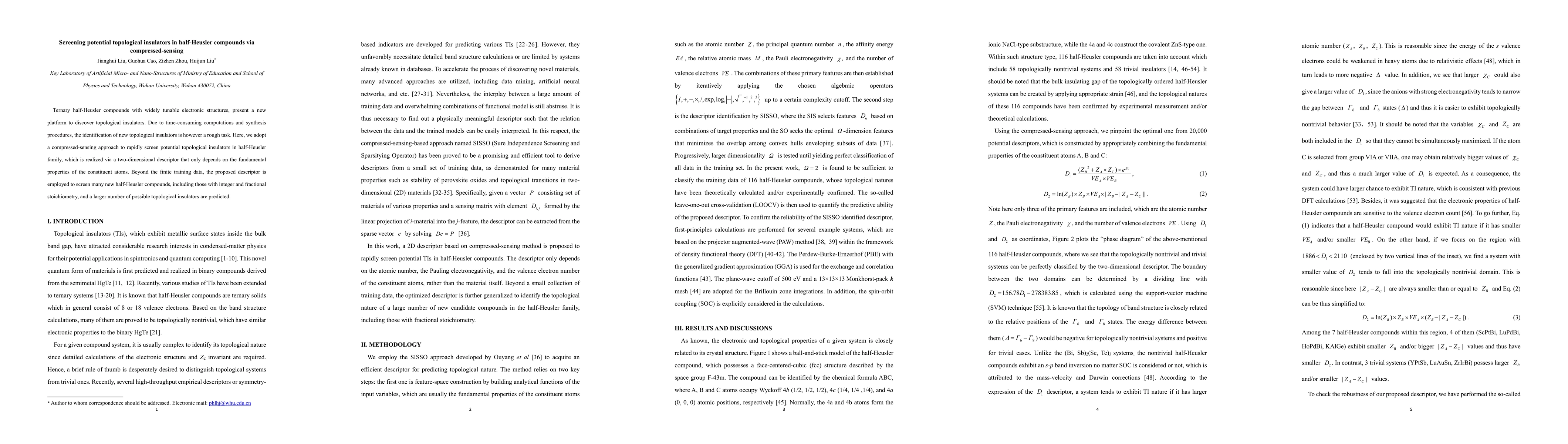Ternary half-Heusler compounds with widely tunable electronic structures, present a new platform to discover topological insulators. Due to time-consuming computations and synthesis procedures, the identification of new topological insulators is however a rough task. Here, we adopt a compressed-sensing approach to rapidly screen potential topological insulators in half-Heusler family, which is realized via a two-dimensional descriptor that only depends on the fundamental properties of the constituent atoms. Beyond the finite training data, the proposed descriptor is employed to screen many new half-Heusler compounds, including those with integer and fractional stoichiometry, and a larger number of possible topological insulators are predicted.