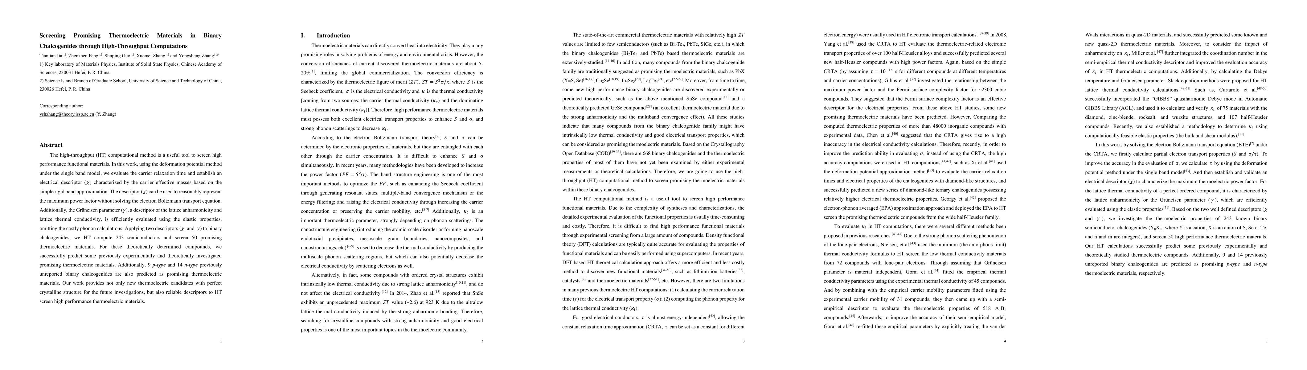 This paper employs high-throughput computational methods to screen binary chalcogenides for promising thermoelectric materials using two descriptors: an electrical descriptor (\c{hi}) and the Grüneisen parameter ({\gamma}). The study identifies 50 promising thermoelectric materials, including 23 previously known and 23 new candidates.