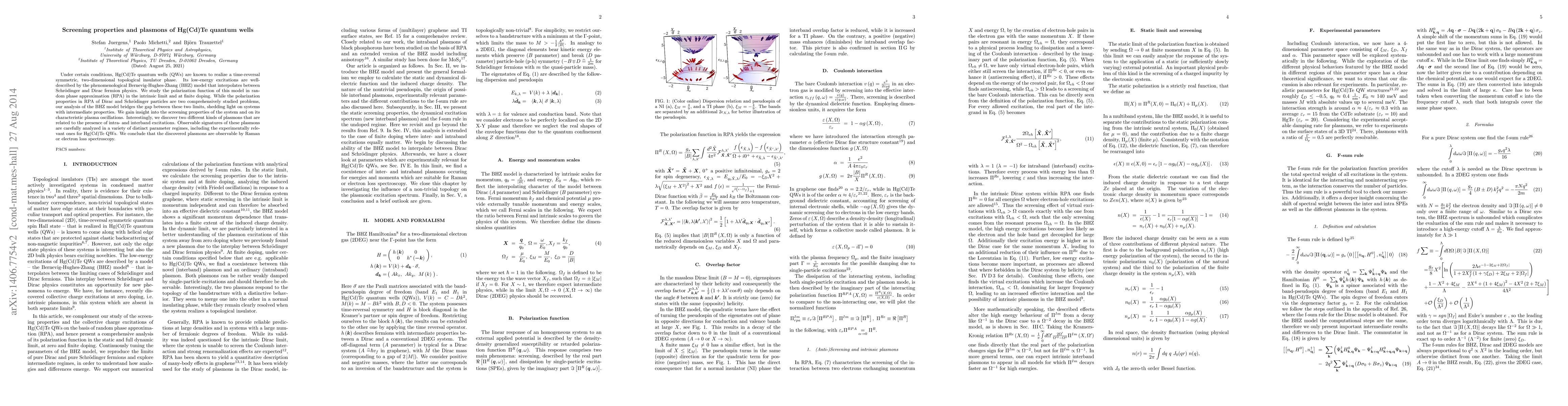 This paper explores the screening properties and plasmons in Hg(Cd)Te quantum wells, focusing on their topological insulator phase described by the BHZ model. It reveals two types of plasmons linked to intra- and interband excitations, with potential observable signatures via Raman or electron loss spectroscopy.