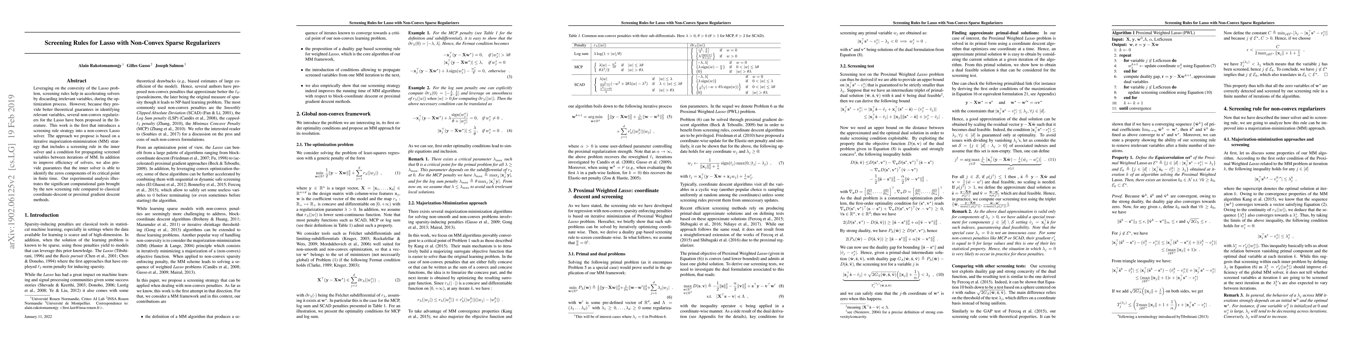 This paper introduces a novel screening rule strategy for non-convex sparse regularizers in Lasso optimization, employing an iterative majorization-minimization method to enhance solver efficiency. It provides theoretical guarantees for identifying zero components and demonstrates significant computational gains over traditional methods.