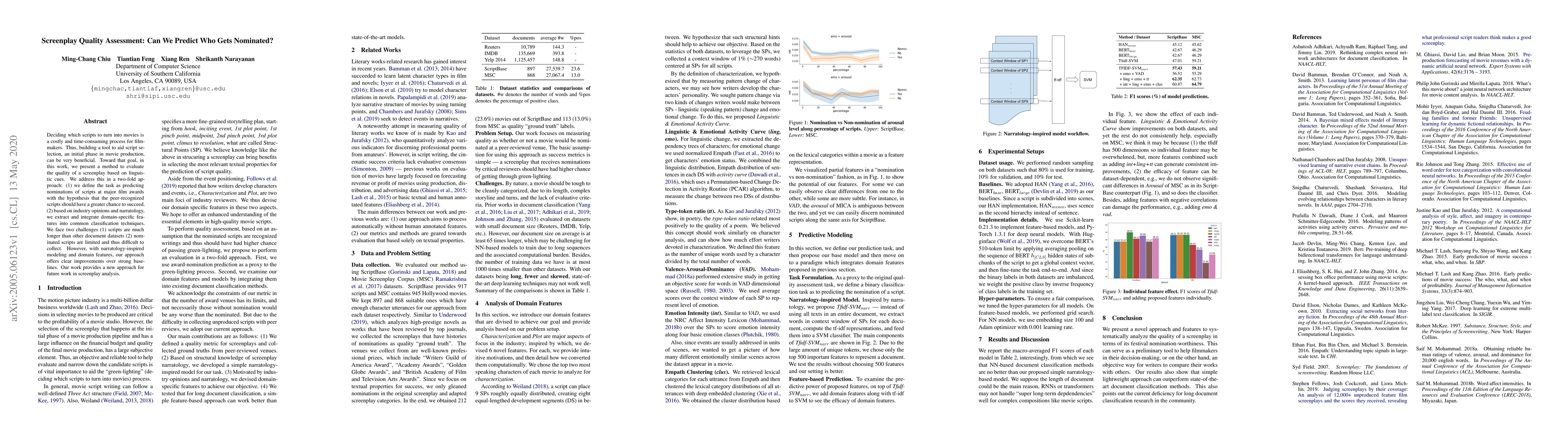 Deciding which scripts to turn into movies is a costly and time-consuming process for filmmakers. Thus, building a tool to aid script selection, an initial phase in movie production, can be very beneficial. Toward that goal, in this work, we present a method to evaluate the quality of a screenplay based on linguistic cues. We address this in a two-fold approach: (1) we define the task as predicting nominations of scripts at major film awards with the hypothesis that the peer-recognized scripts should have a greater chance to succeed. (2) based on industry opinions and narratology, we extract and integrate domain-specific features into common classification techniques. We face two challenges (1) scripts are much longer than other document datasets (2) nominated scripts are limited and thus difficult to collect. However, with narratology-inspired modeling and domain features, our approach offers clear improvements over strong baselines. Our work provides a new approach for future work in screenplay analysis.
