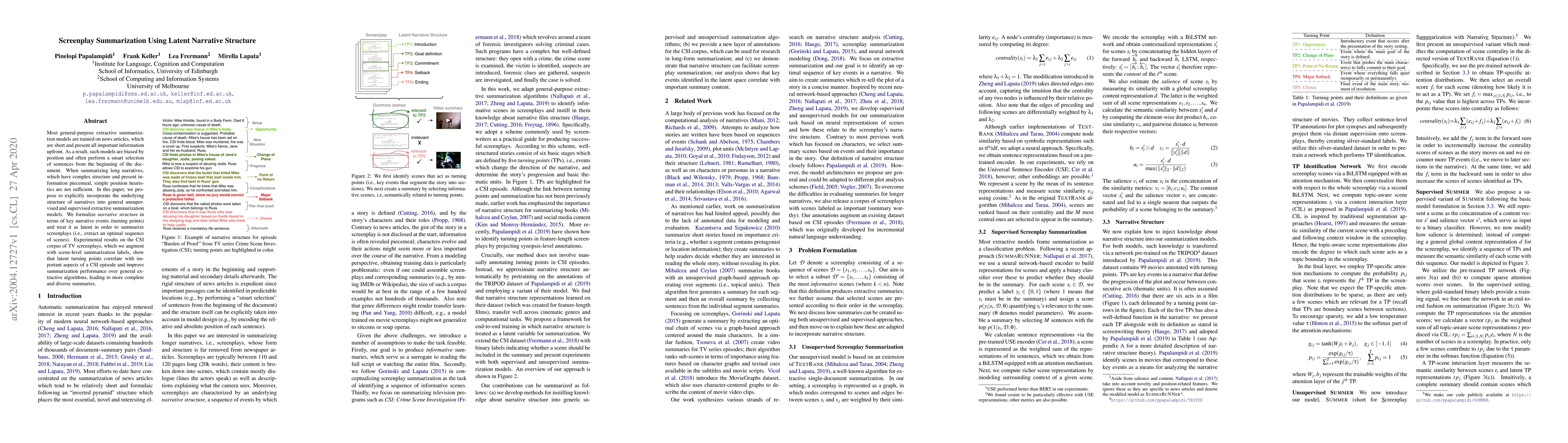 This paper proposes a method to improve screenplay summarization by incorporating latent narrative structures, specifically key narrative events, into summarization models. The results show that this approach leads to more complete and diverse summaries compared to general extractive algorithms.