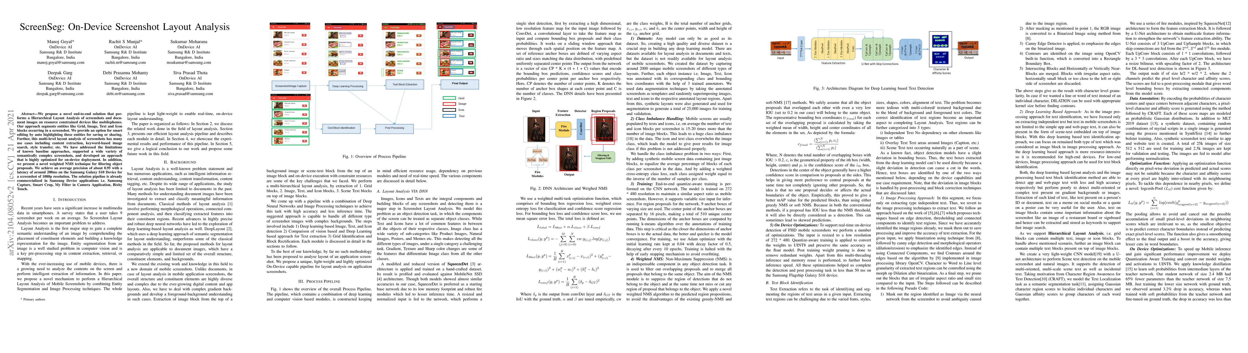 ScreenSeg offers an end-to-end solution for on-device hierarchical layout analysis of screenshots and document images, segmenting entities like Grid, Image, Text, and Icon blocks. It achieves an average precision of 0.95 with 200ms latency on Samsung Galaxy S10, and is commercialized in Samsung's Capture, Smart Crop, My Filter, and Bixby Touch applications.